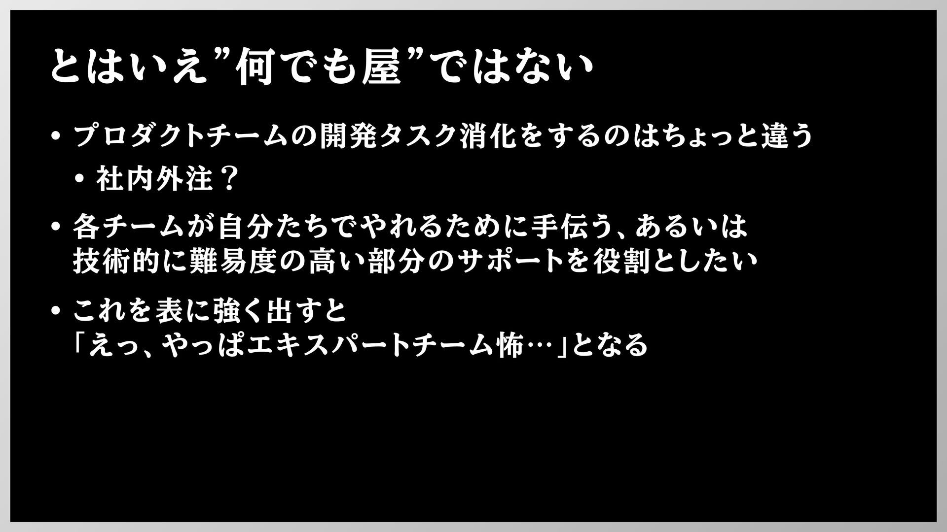 とはいえ"何でも屋"ではない • プロダクトチームの開発タスク消化をするのはちょっと違う • 社内外注? • 各チームが自分たちでやれるために手伝う、あるいは 技術的に難易度の高い部分のサポートを役割としたい • これを表に強く出すと