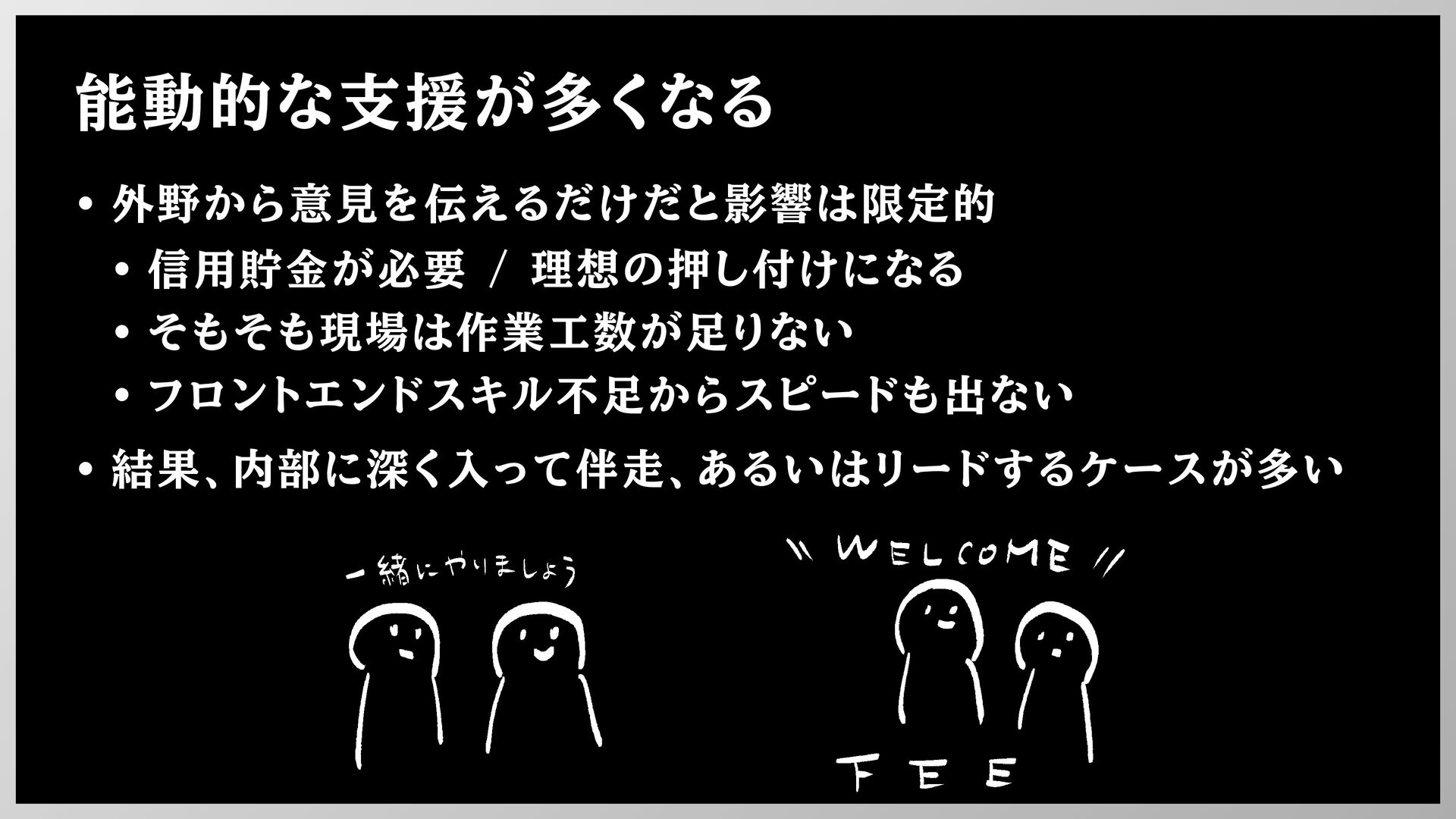 フロントエンドスキル不足からスピードも出ない • 結果、内部に深く入って伴走、あるいはリードするケースが多い