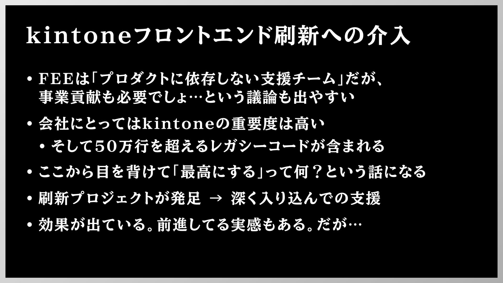 kintoneフロントエンド刷新への介入 • FEEは「プロダクトに依存しない支援チーム」だが、 事業貢献も必要でしょ…という議論も出やすい • 会社にとってはkintoneの重要度は高い • そして50万行を超えるレガシーコードが含まれる • ここから目を背けて「最高にする」って何?という話になる