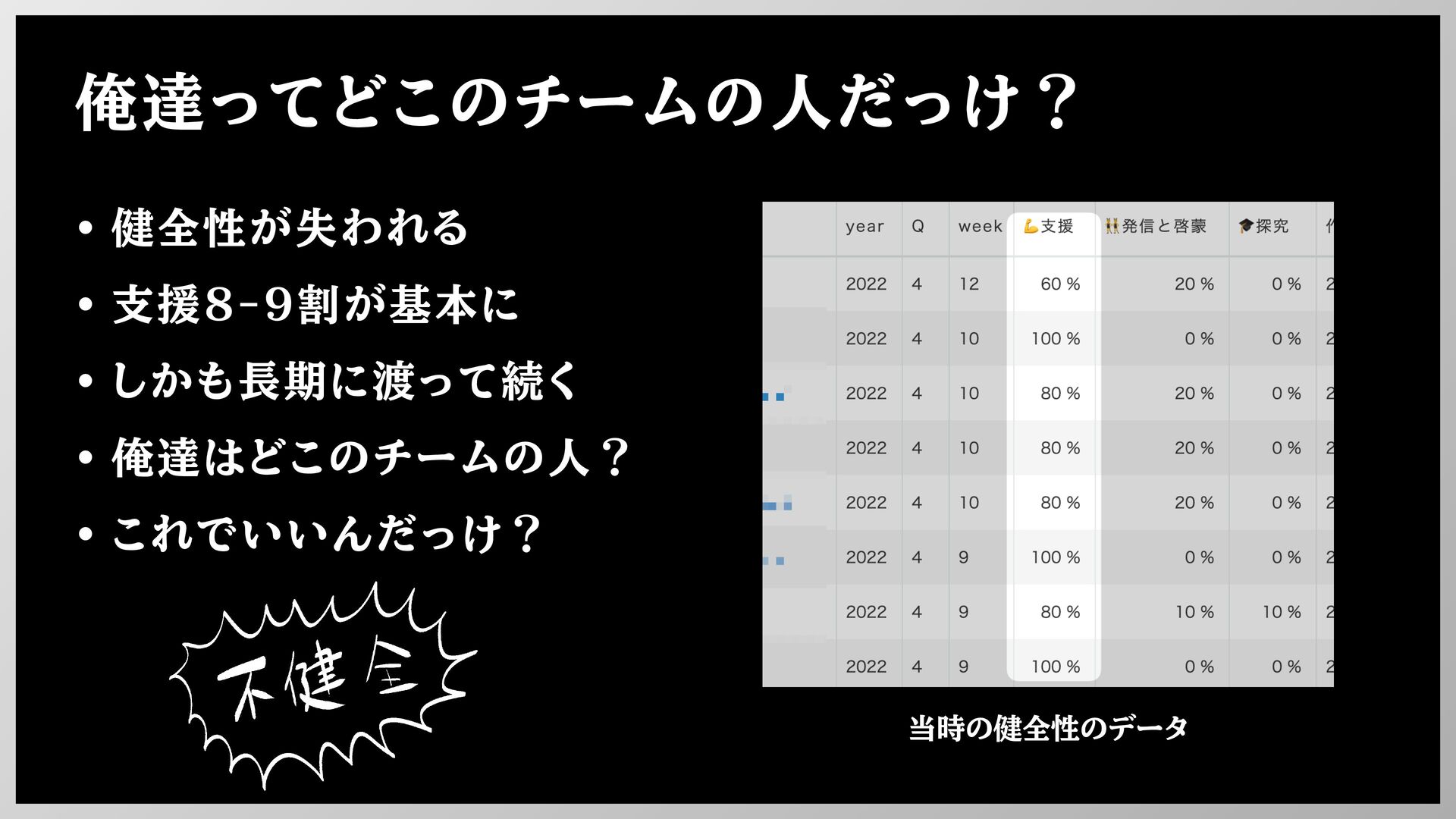 俺達ってどこのチームの人だっけ? • 健全性が失われる • 支援8-9割が基本に • しかも長期に渡って続く • 俺達はどこのチームの人? •