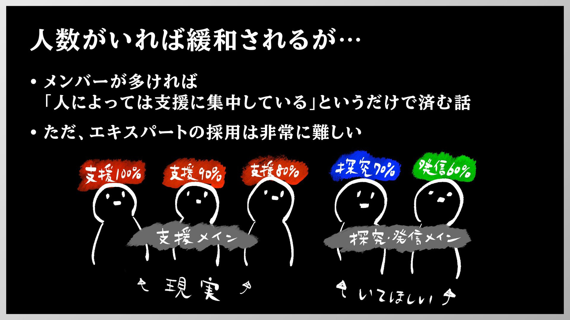 人数がいれば緩和されるが… • メンバーが多ければ 「人によっては支援に集中している」というだけで済む話 • ただ、エキスパートの採用は非常に難しい