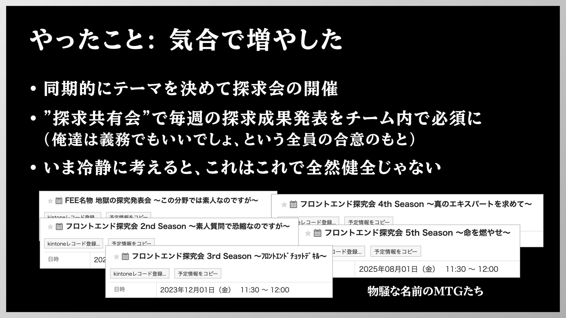 やったこと: 気合で増やした • 同期的にテーマを決めて探求会の開催 • "探求共有会"で毎週の探求成果発表をチーム内で必須に (俺達は義務でもいいでしょ、という全員の合意のもと) • いま冷静に考えると、これはこれで全然健全じゃない 物騒な名前のMTGたち