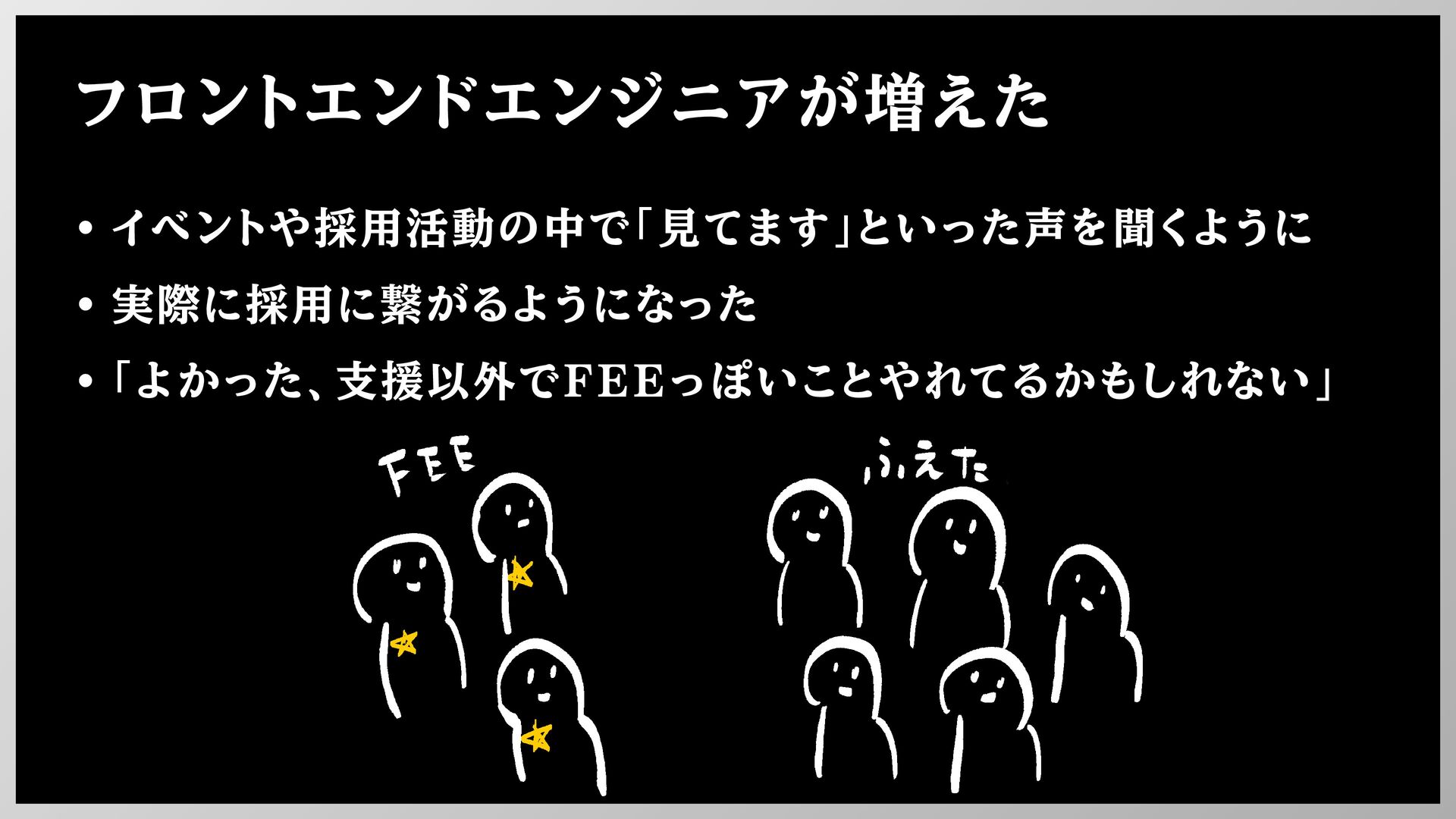 フロントエンドエンジニアが増えた • イベントや採用活動の中で「見てます」といった声を聞くように • 実際に採用に繋がるようになった • 「よかった、支援以外でFEEっぽいことやれてるかもしれない」