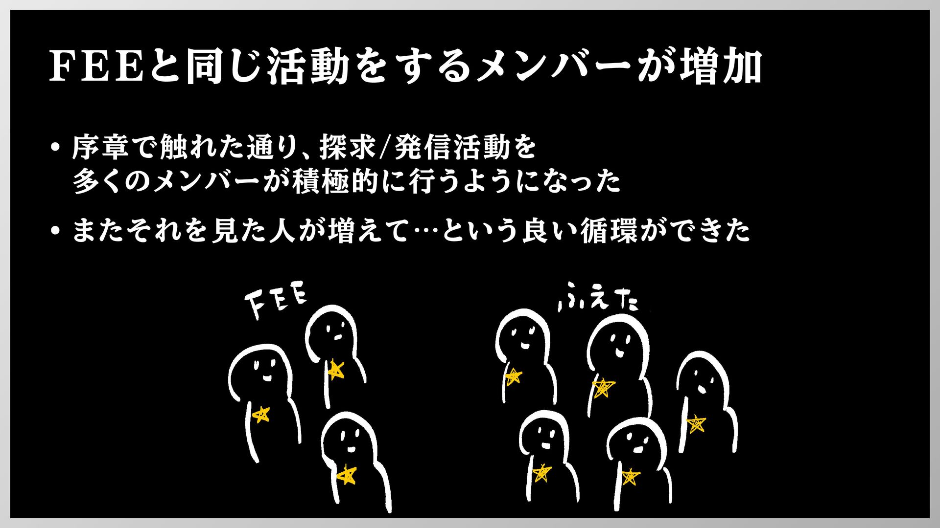 FEEと同じ活動をするメンバーが増加 • 序章で触れた通り、探求/発信活動を 多くのメンバーが積極的に行うようになった • またそれを見た人が増えて…という良い循環ができた