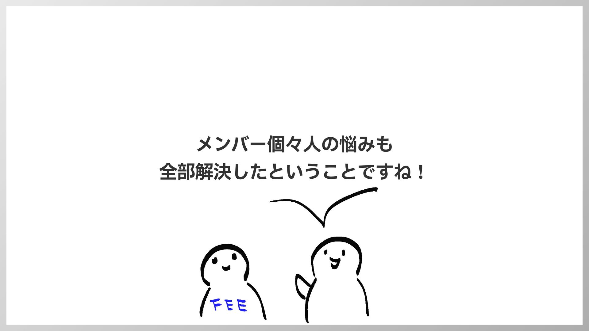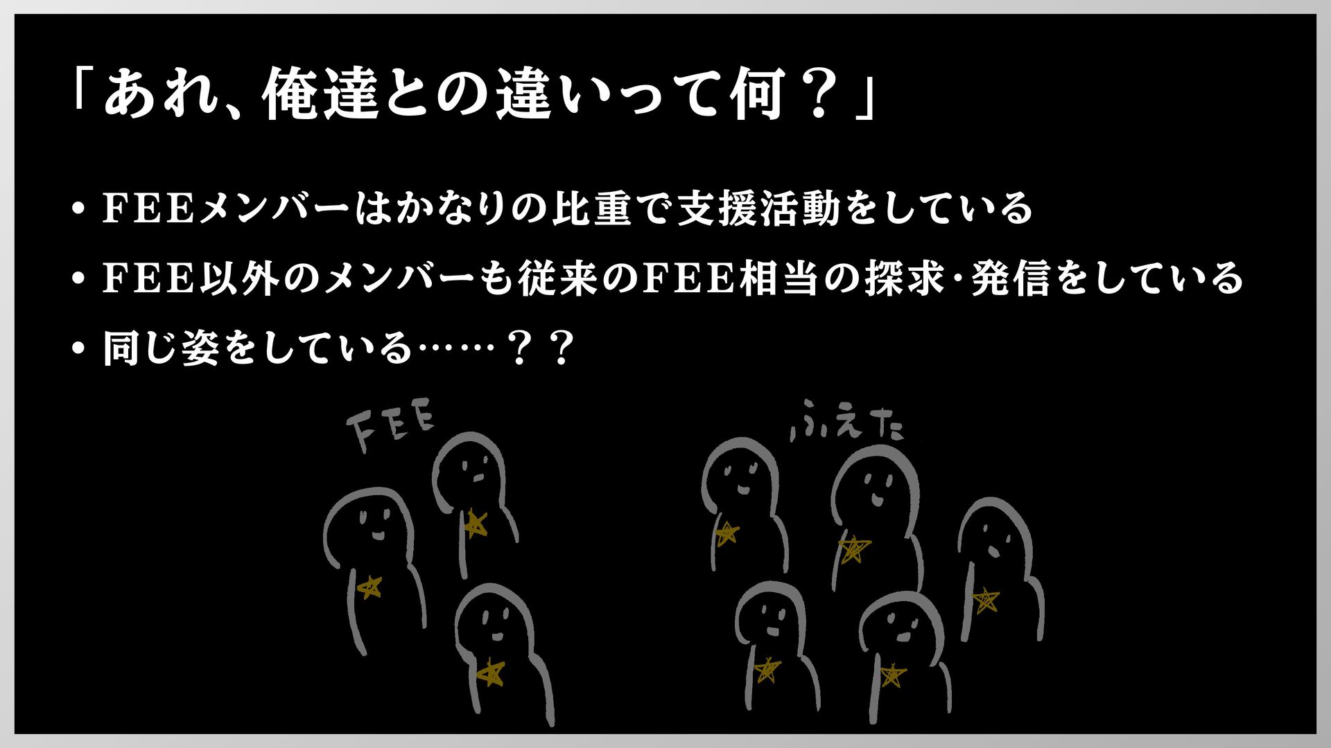 「あれ、俺達との違いって何?」 • FEEメンバーはかなりの比重で支援活動をしている • FEE以外のメンバーも従来のFEE相当の探求・発信をしている • 同じ姿をしている……??