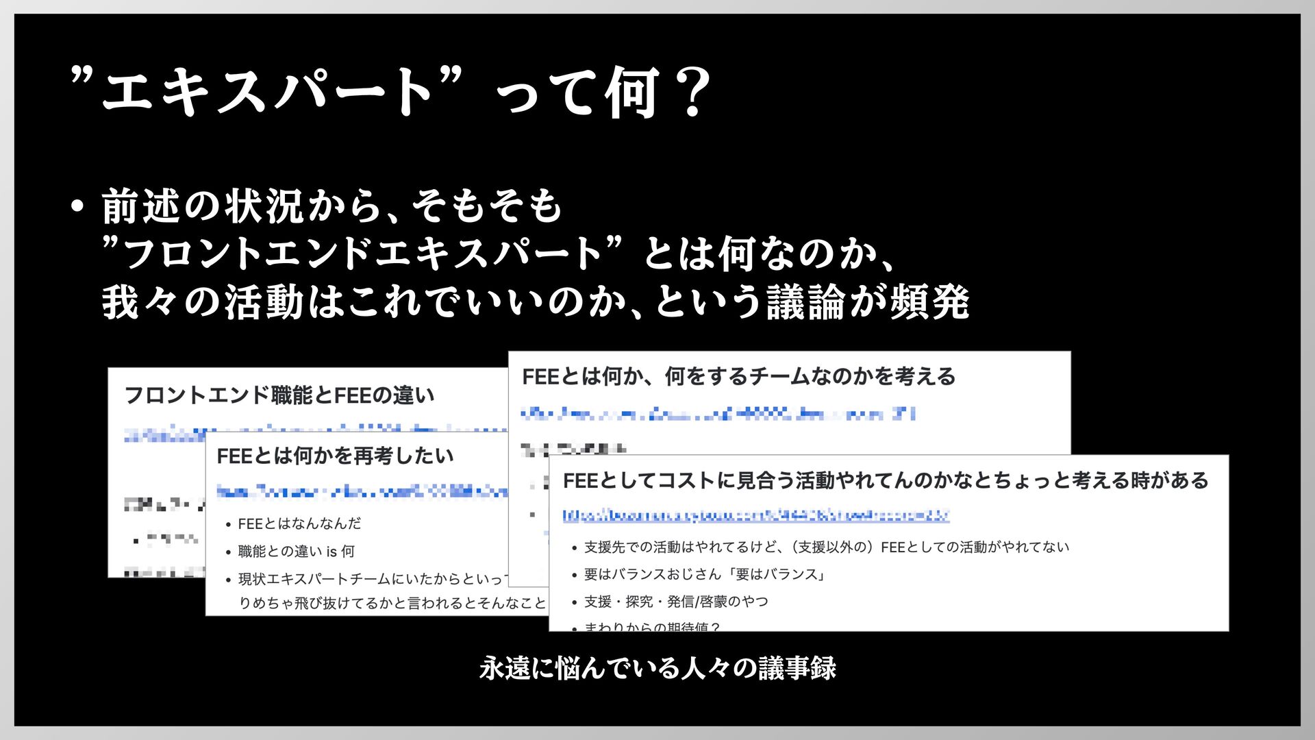 "エキスパート" って何? • 前述の状況から、そもそも "フロントエンドエキスパート" とは何なのか、 我々の活動はこれでいいのか、という議論が頻発 永遠に悩んでいる人々の議事録