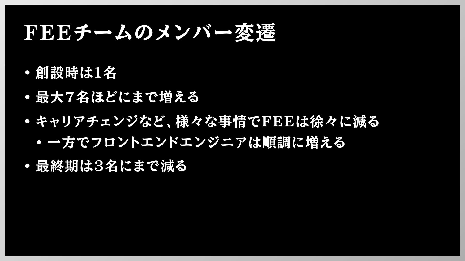 FEEチームのメンバー変遷 • 創設時は1名 • 最大7名ほどにまで増える • キャリアチェンジなど、様々な事情でFEEは徐々に減る • 一方でフロントエンドエンジニアは順調に増える •