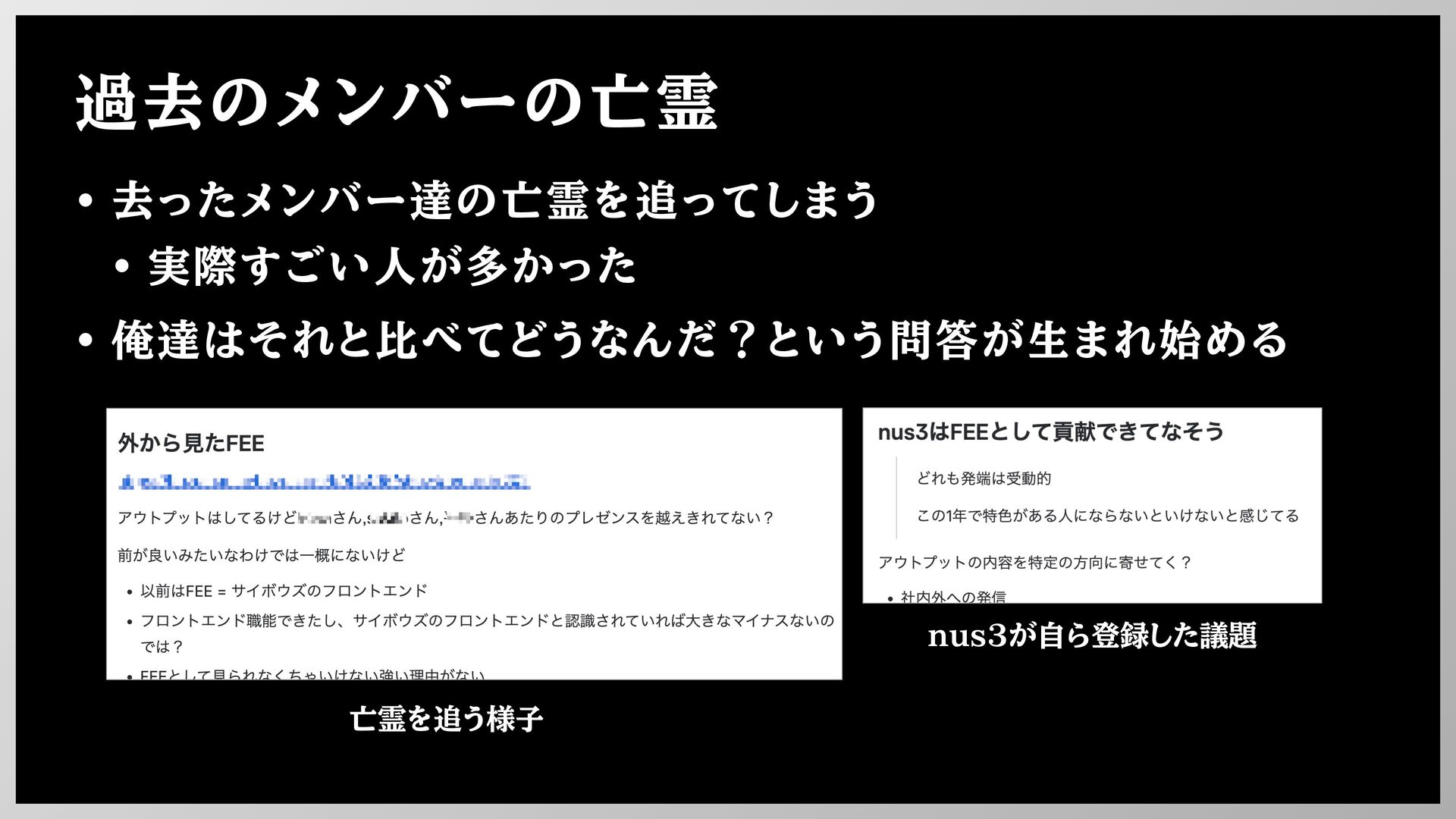 過去のメンバーの亡霊 • 去ったメンバー達の亡霊を追ってしまう • 実際すごい人が多かった • 俺達はそれと比べてどうなんだ?という問答が生まれ始める 亡霊を追う様子 nus3が自ら登録した議題