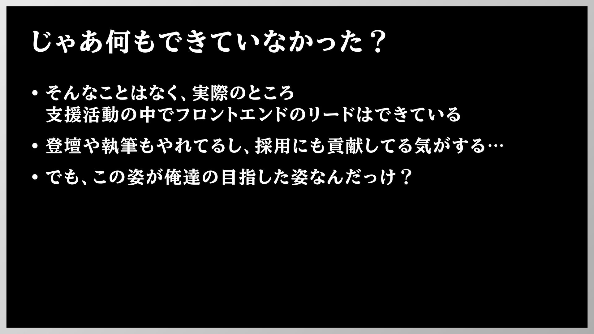 じゃあ何もできていなかった? • そんなことはなく、実際のところ 支援活動の中でフロントエンドのリードはできている • 登壇や執筆もやれてるし、採用にも貢献してる気がする… • でも、この姿が俺達の目指した姿なんだっけ?