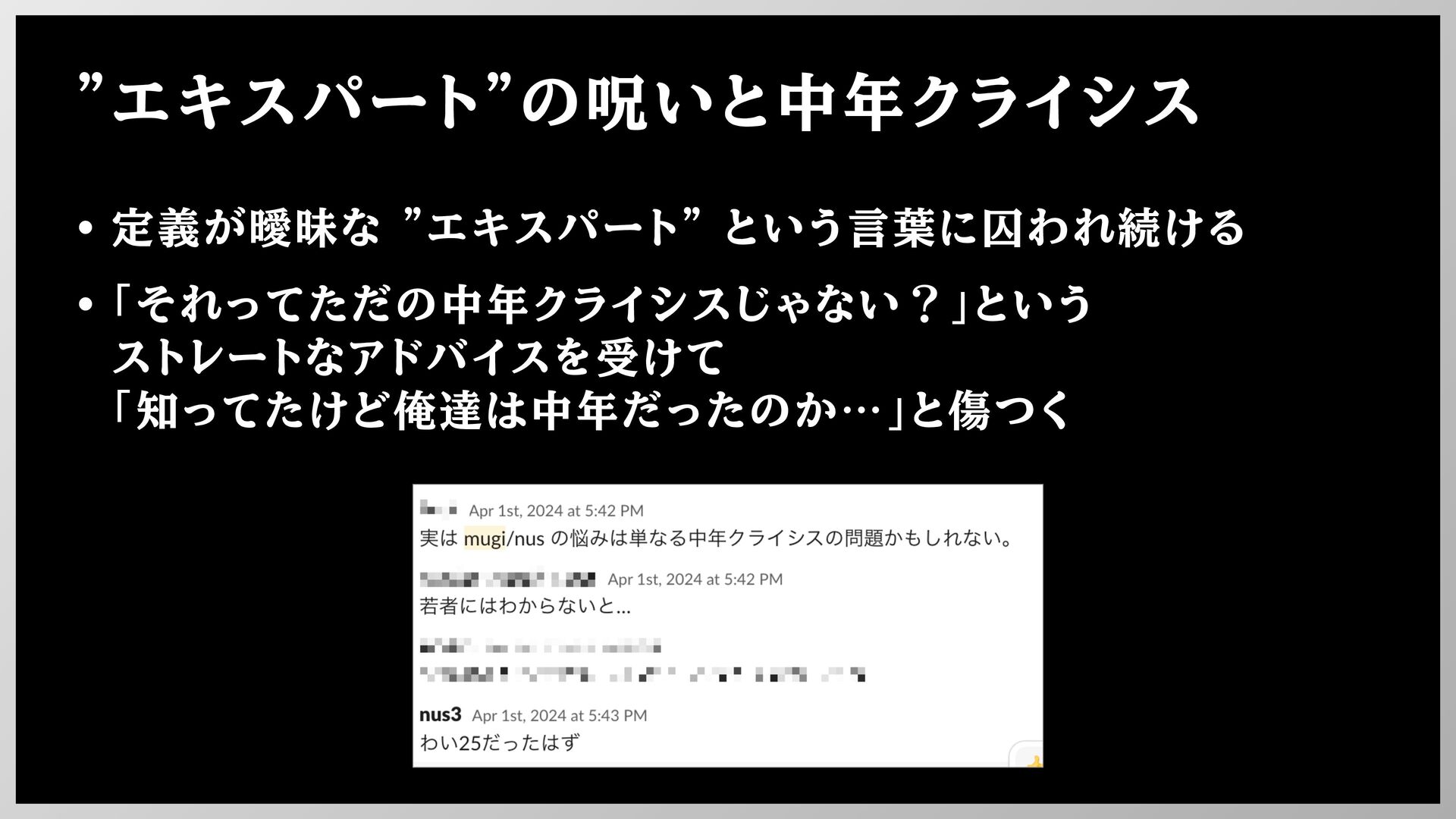 "エキスパート"の呪いと中年クライシス • 定義が曖昧な "エキスパート" という言葉に囚われ続ける • 「それってただの中年クライシスじゃない?」という ストレートなアドバイスを受けて 「知ってたけど俺達は中年だったのか…」と傷つく