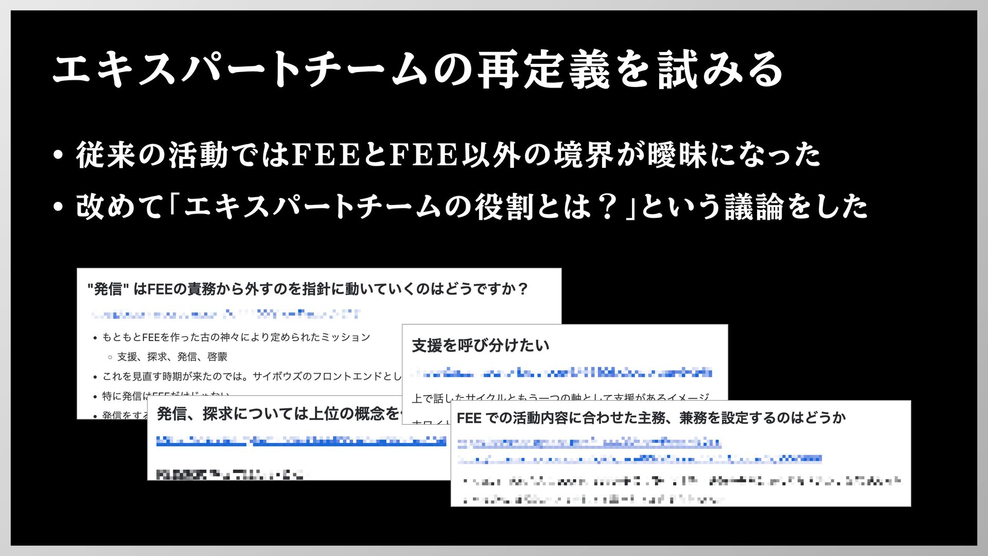 エキスパートチームの再定義を試みる • 従来の活動ではFEEとFEE以外の境界が曖昧になった • 改めて「エキスパートチームの役割とは?」という議論をした