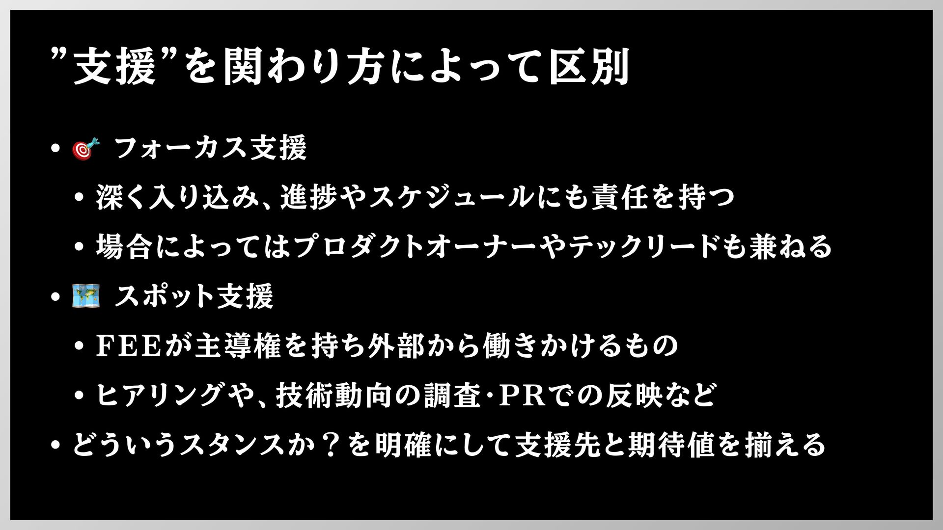 "支援"を関わり方によって区別 • 🎯 フォーカス支援 • 深く入り込み、進捗やスケジュールにも責任を持つ • 場合によってはプロダクトオーナーやテックリードも兼ねる • 🗺