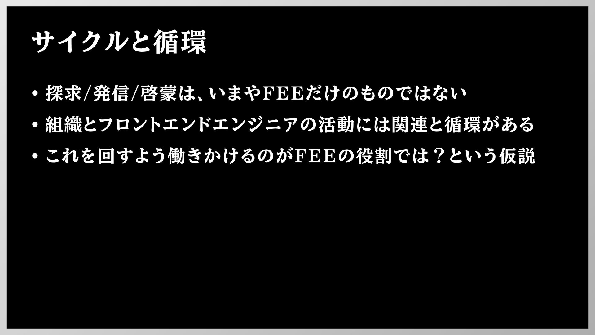 サイクルと循環 • 探求/発信/啓蒙は、いまやFEEだけのものではない • 組織とフロントエンドエンジニアの活動には関連と循環がある • これを回すよう働きかけるのがFEEの役割では?という仮説