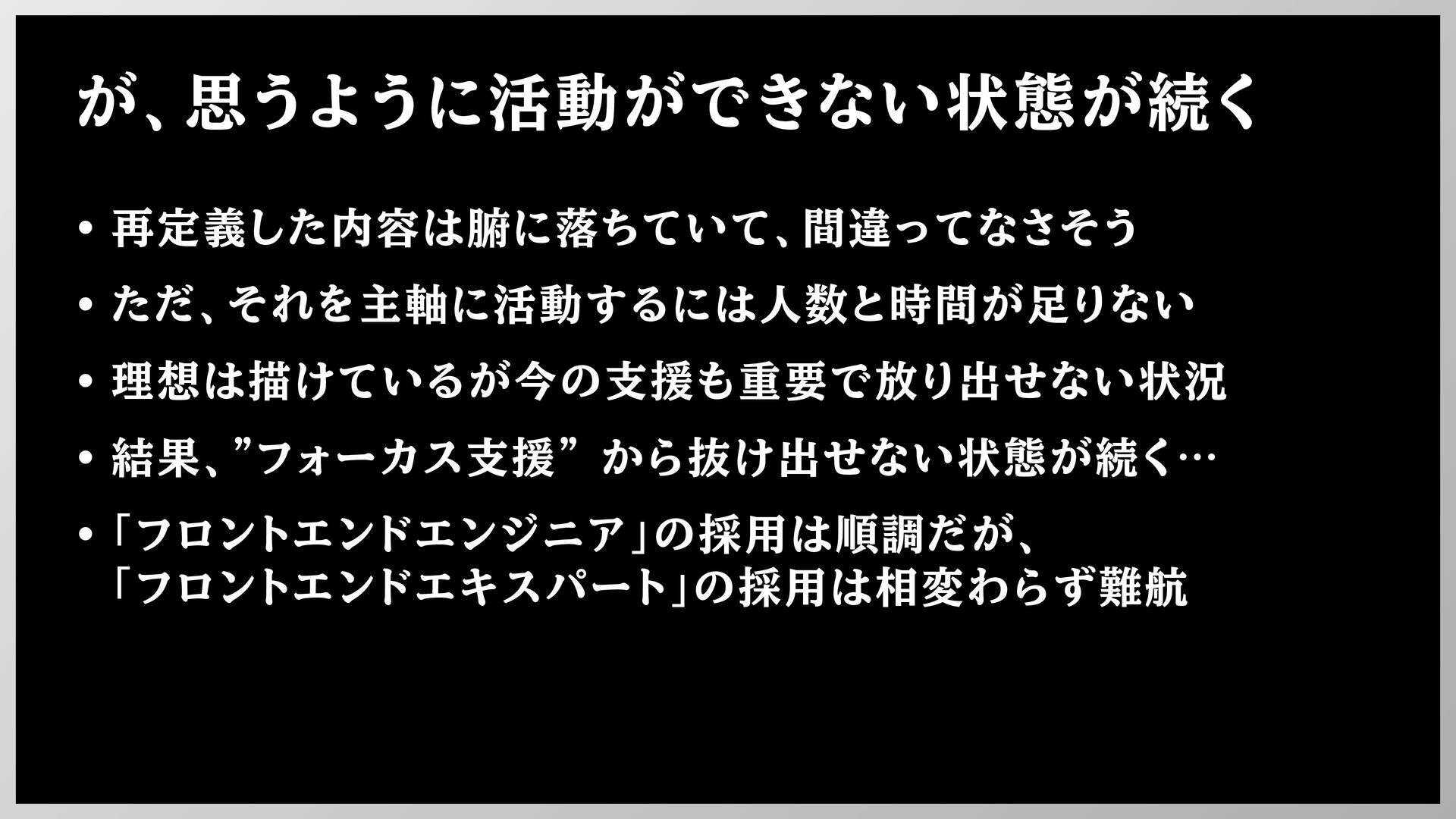 が、思うように活動ができない状態が続く • 再定義した内容は腑に落ちていて、間違ってなさそう • ただ、それを主軸に活動するには人数と時間が足りない • 理想は描けているが今の支援も重要で放り出せない状況 • 結果、"フォーカス支援" から抜け出せない状態が続く…