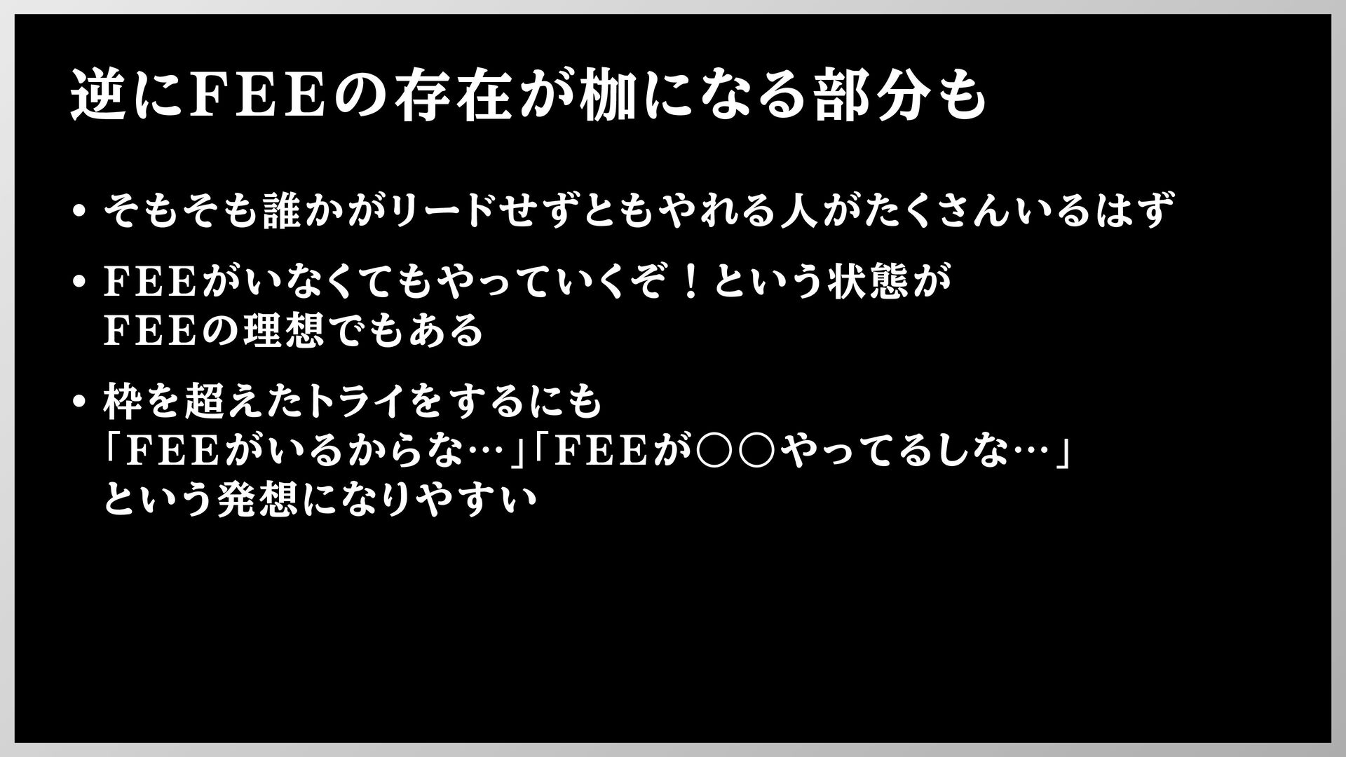 逆にFEEの存在が枷になる部分も • そもそも誰かがリードせずともやれる人がたくさんいるはず • FEEがいなくてもやっていくぞ!という状態が FEEの理想でもある • 枠を超えたトライをするにも 「FEEがいるからな…」「FEEが◦◦やってるしな…」 という発想になりやすい