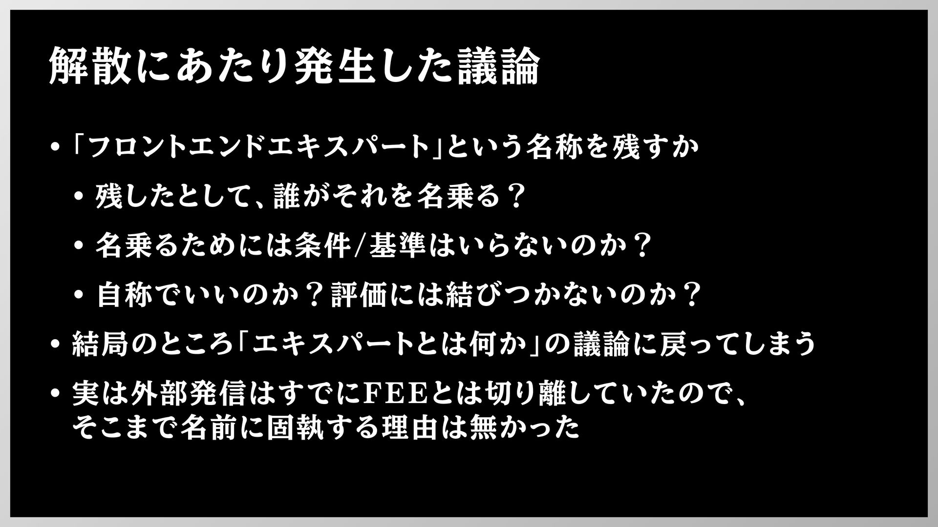 解散にあたり発生した議論 • 「フロントエンドエキスパート」という名称を残すか • 残したとして、誰がそれを名乗る? • 名乗るためには条件/基準はいらないのか? • 自称でいいのか?評価には結びつかないのか? •