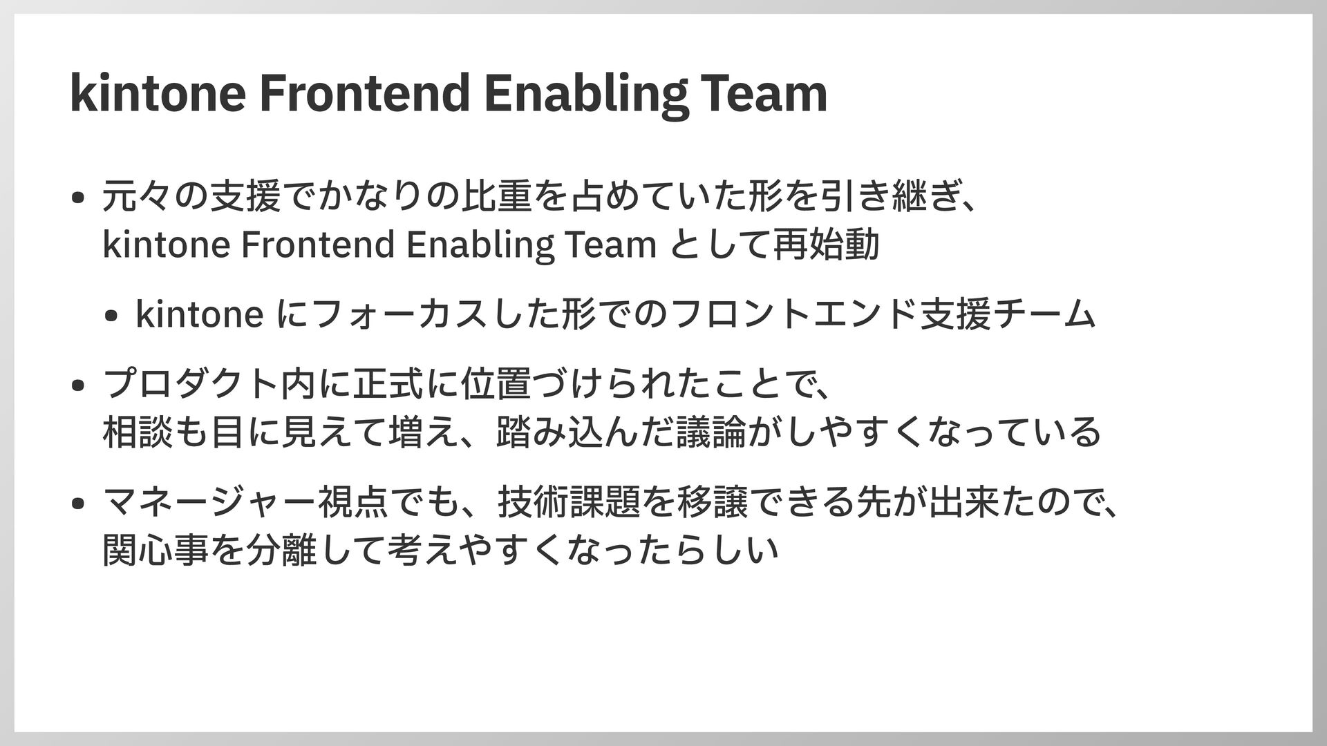 kintone Frontend Enabling Team として再始動 • kintone にフォーカスした形でのフロントエンド 支 援チーム • プロダクト内に正式に位置づけられたことで、 相談も 目 に 見 えて増え、踏み込んだ議論がしやすくなっている • マネージャー視点でも、技術課題を移譲できる先が出来たので、 関 心 事を分離して考えやすくなったらしい