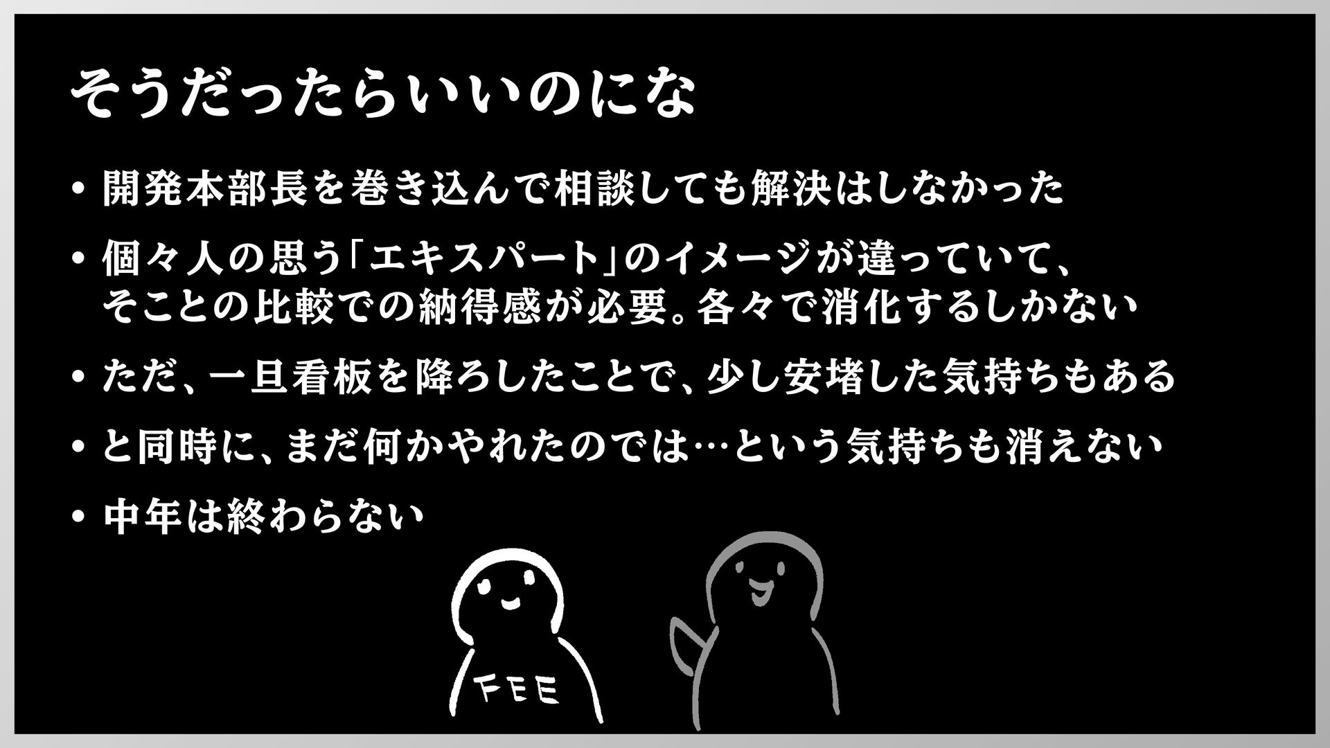 そうだったらいいのにな • 開発本部長を巻き込んで相談しても解決はしなかった • 個々人の思う「エキスパート」のイメージが違っていて、 そことの比較での納得感が必要。各々で消化するしかない • ただ、一旦看板を降ろしたことで、少し安堵した気持ちもある • と同時に、まだ何かやれたのでは…という気持ちも消えない
