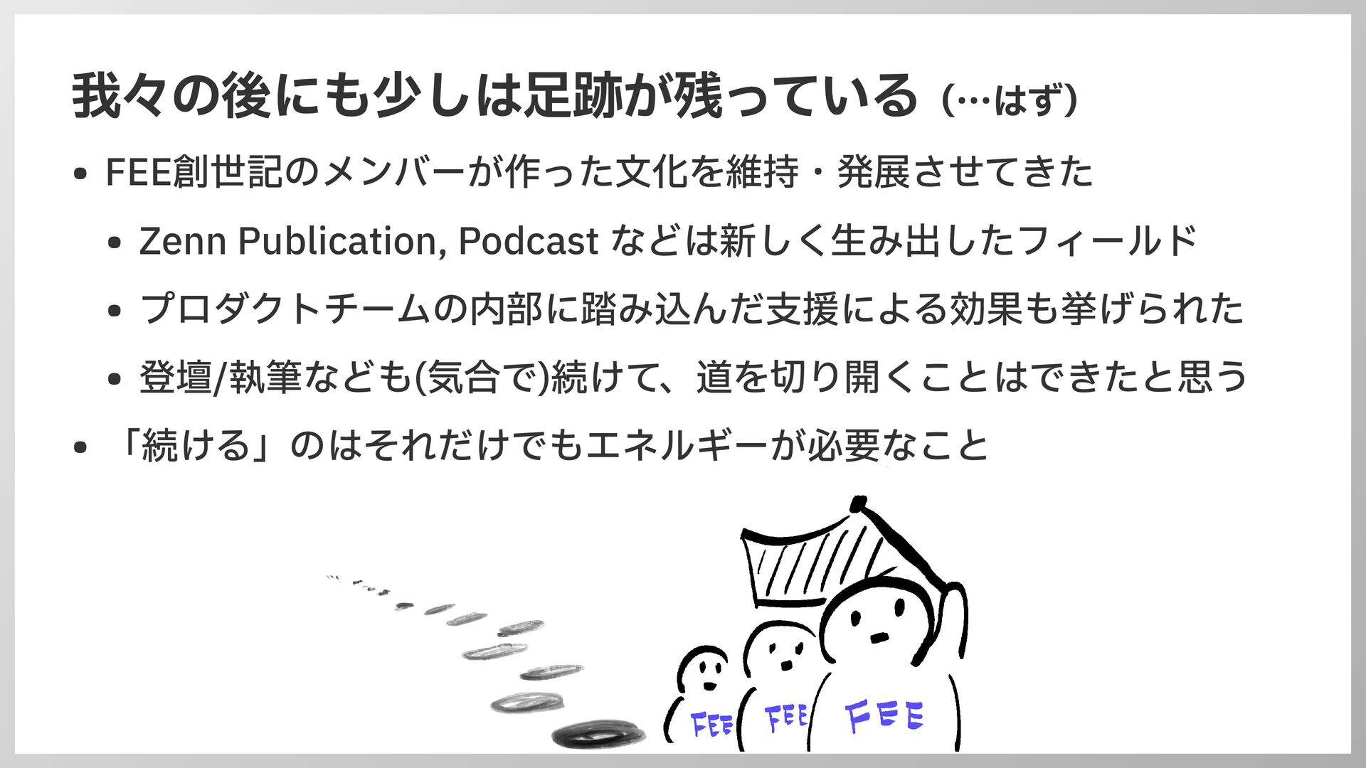 我々の後にも少しは 足 跡が残っている(…はず) • FEE創世記のメンバーが作った 文 化を維持・発展させてきた • Zenn Publication,