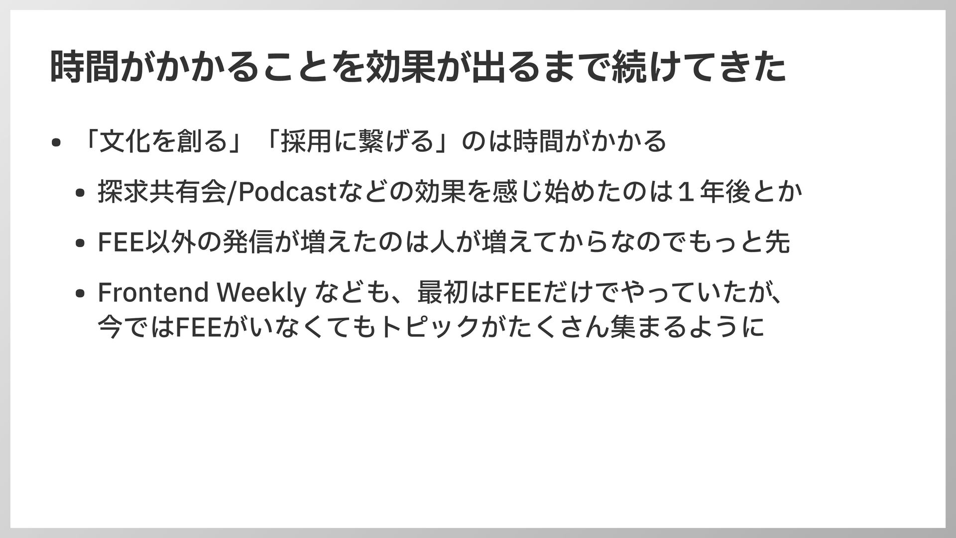 FEE以外の発信が増えたのは 人 が増えてからなのでもっと先 • Frontend Weekly なども、最初はFEEだけでやっていたが、 今ではFEEがいなくてもトピックがたくさん集まるように