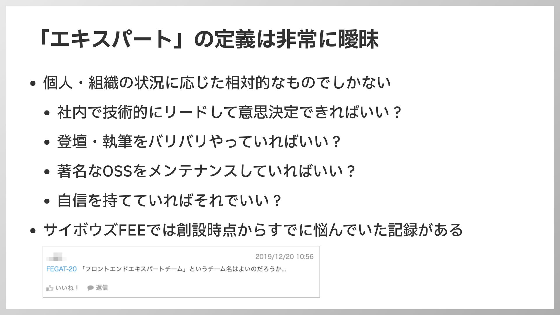 登壇・執筆をバリバリやっていればいい? • 著名なOSSをメンテナンスしていればいい? • 自 信を持てていればそれでいい? • サイボウズFEEでは創設時点からすでに悩んでいた記録がある