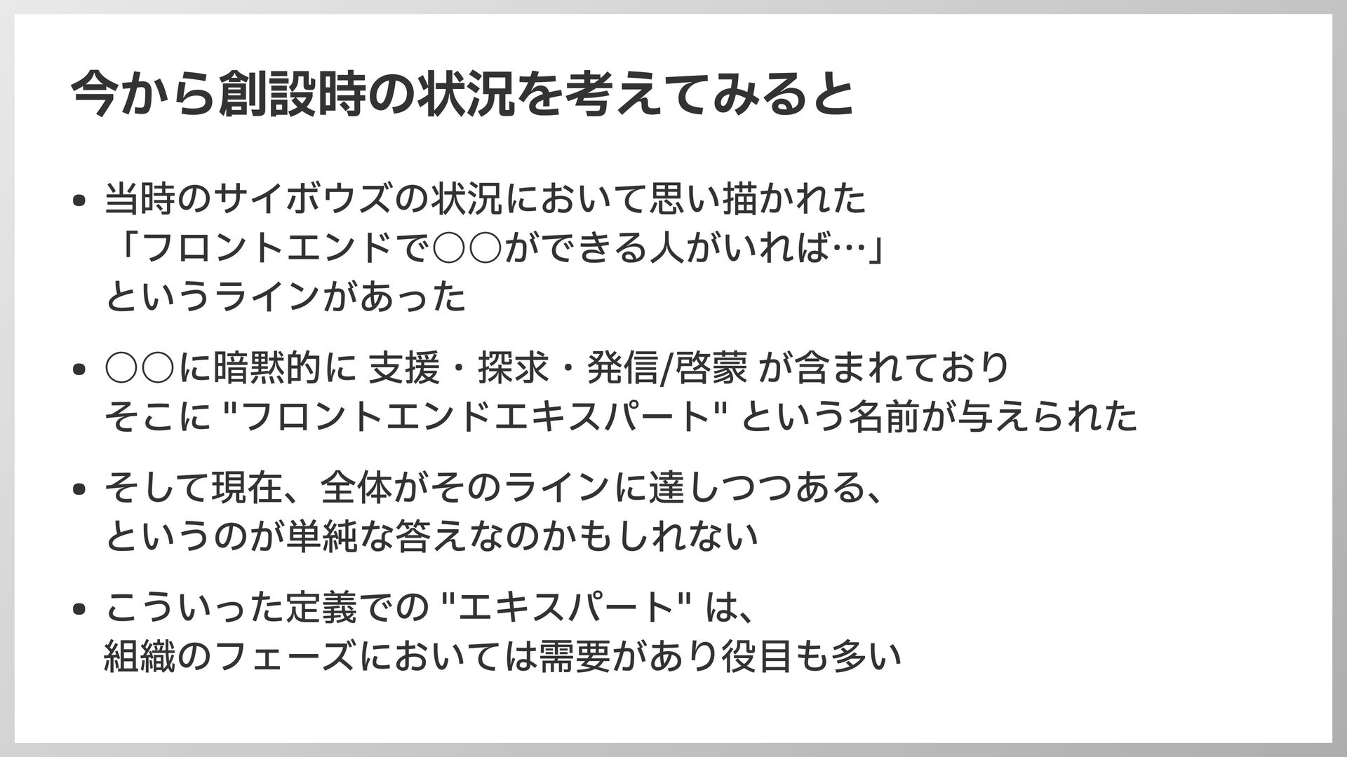 援・探求・発信/啓蒙 が含まれており そこに "フロントエンドエキスパート" という名前が与えられた • そして現在、全体がそのラインに達しつつある、 というのが単純な答えなのかもしれない • こういった定義での "エキスパート" は、 組織のフェーズにおいては需要があり役 目 も多い