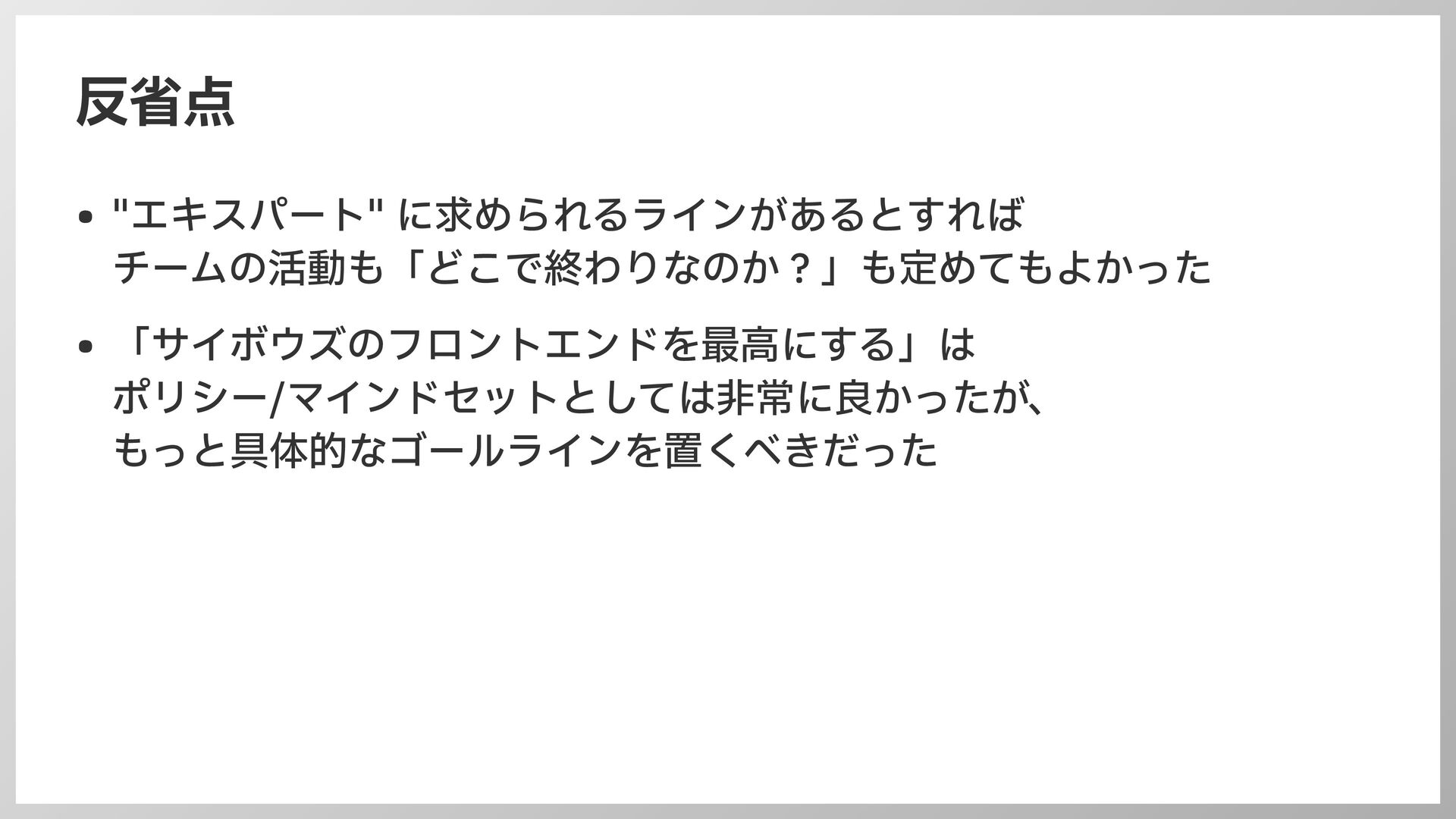 反省点 • "エキスパート" に求められるラインがあるとすれば チームの活動も「どこで終わりなのか?」も定めてもよかった • 「サイボウズのフロントエンドを最 高 にする」は ポリシー/マインドセットとしては