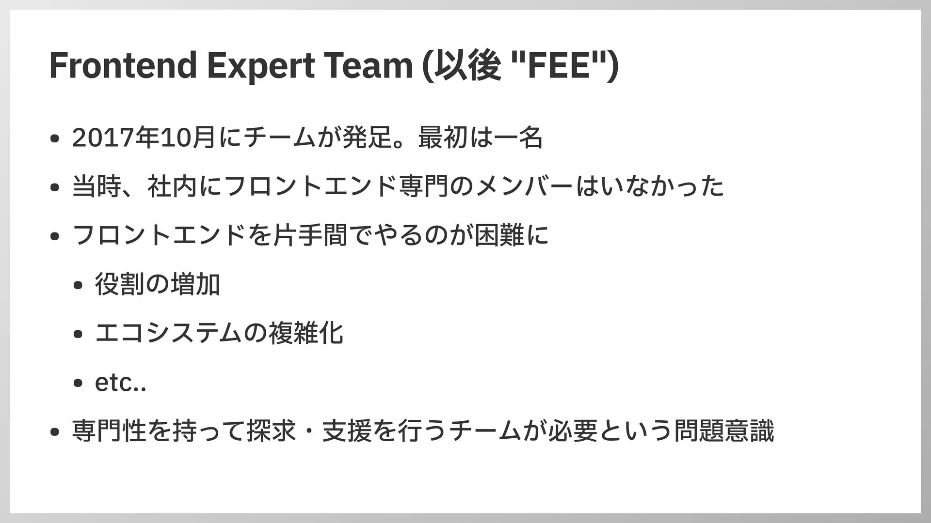 。最初は 一 名 • 当時、社内にフロントエンド専 門 のメンバーはいなかった • フロントエンドを 片手 間でやるのが困難に • 役割の増加 • エコシステムの複雑化 • etc.. • 専 門 性を持って探求・ 支 援を 行 うチームが必要という問題意識