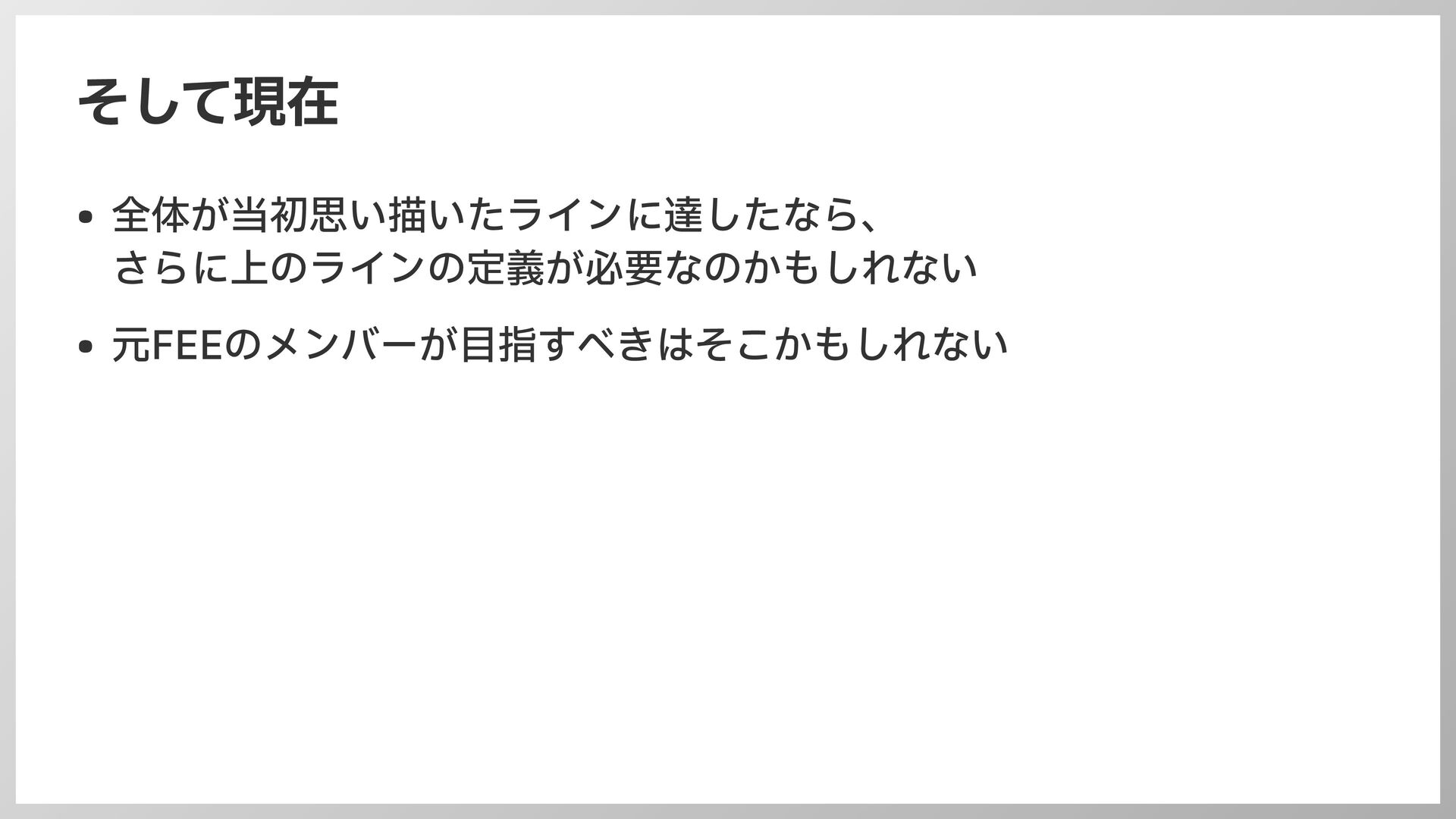 そして現在 • 全体が当初思い描いたラインに達したなら、 さらに上のラインの定義が必要なのかもしれない • 元FEEのメンバーが 目 指すべきはそこかもしれない