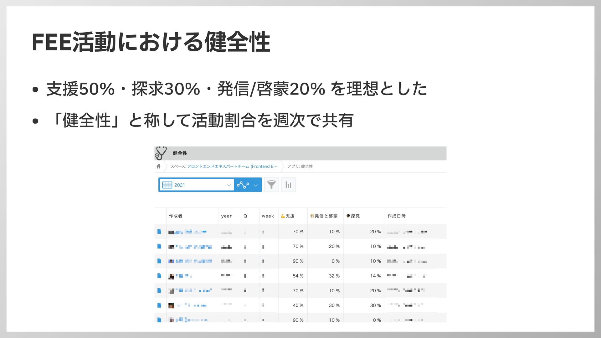 FEE活動における健全性 • 支 援50%・探求30%・発信/啓蒙20% を理想とした • 「健全性」と称して活動割合を週次で共有
