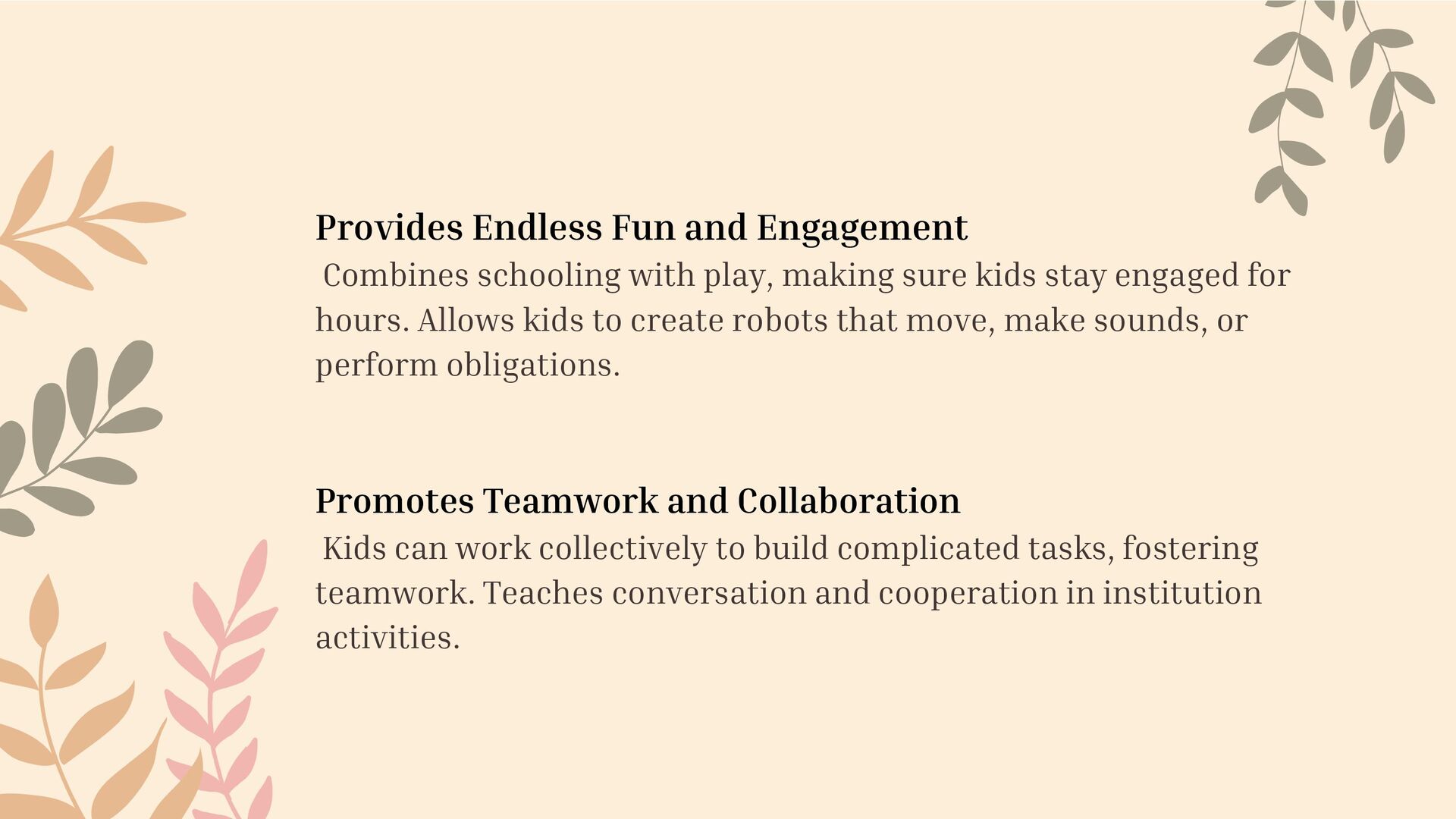 sure kids stay engaged for hours. Allows kids to create robots that move, make sounds, or perform obligations. Promotes Teamwork and Collaboration Kids can work collectively to build complicated tasks, fostering teamwork. Teaches conversation and cooperation in institution activities.