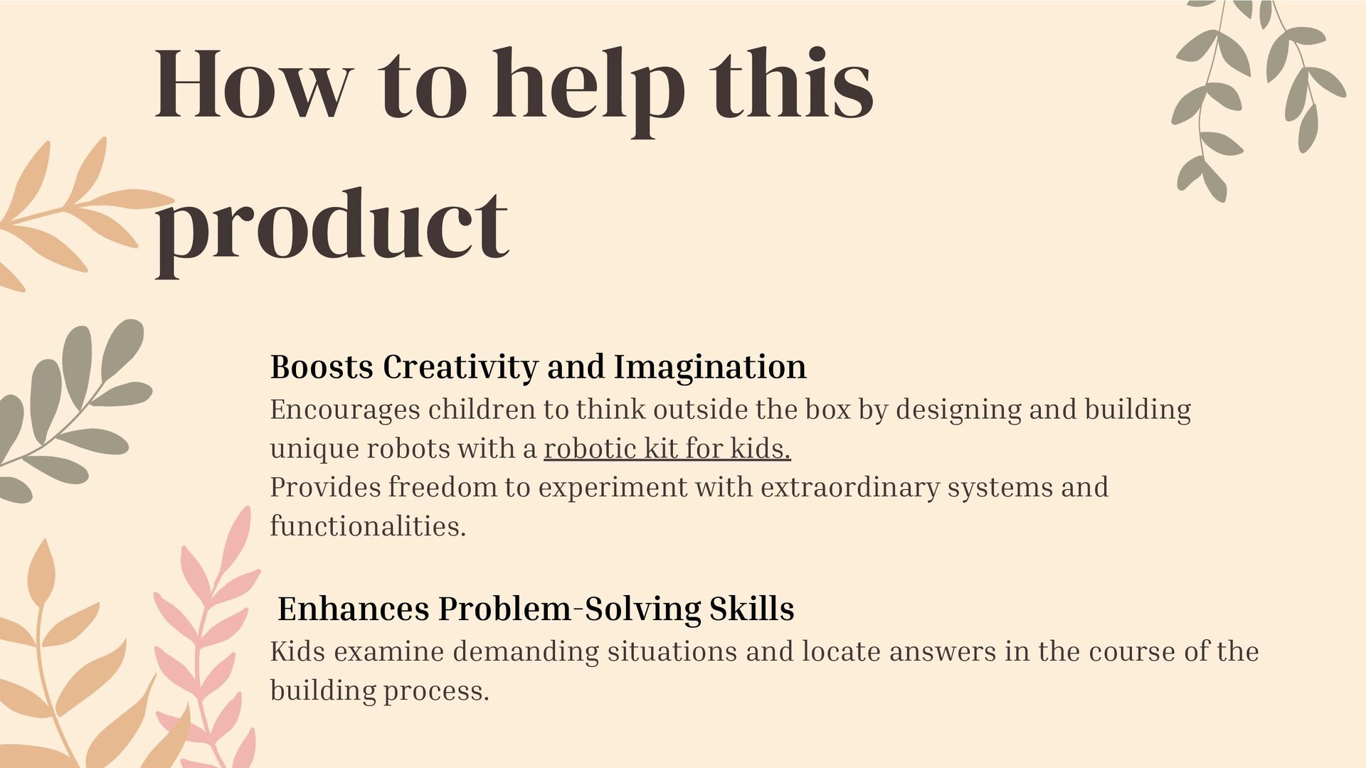 box by designing and building unique robots with a robotic kit for kids. Provides freedom to experiment with extraordinary systems and functionalities. Enhances Problem-Solving Skills Kids examine demanding situations and locate answers in the course of the building process. How to help this product