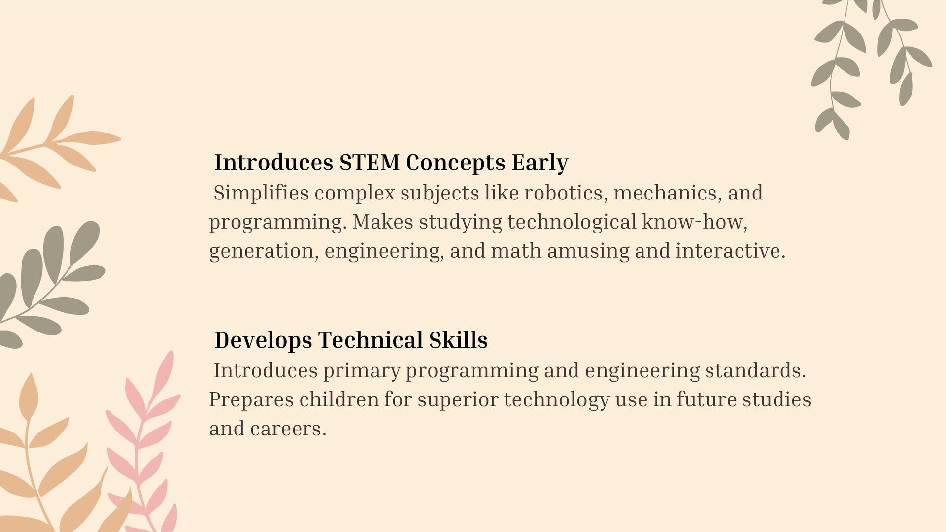 and programming. Makes studying technological know-how, generation, engineering, and math amusing and interactive. Develops Technical Skills Introduces primary programming and engineering standards. Prepares children for superior technology use in future studies and careers.