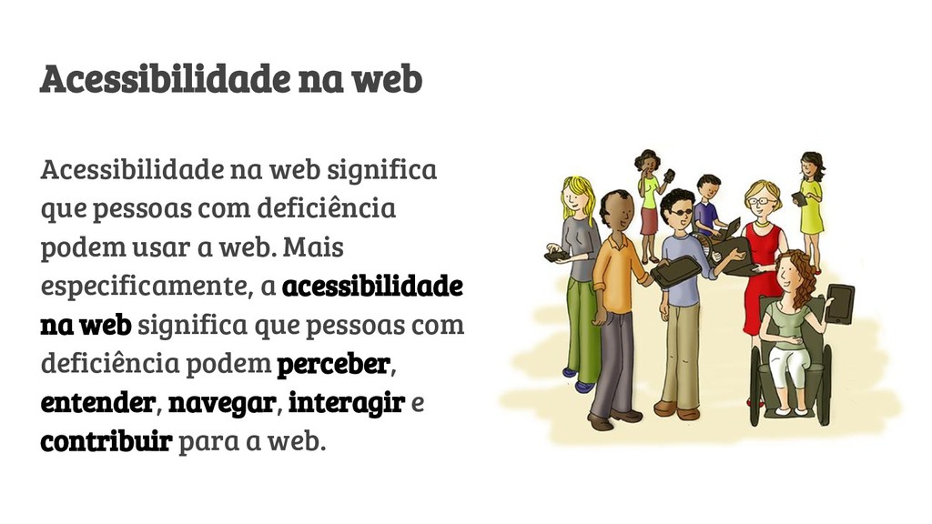 deficiência podem usar a web. Mais especificamente, a acessibilidade na web significa que pessoas com deficiência podem perceber, entender, navegar, interagir e contribuir para a web.
