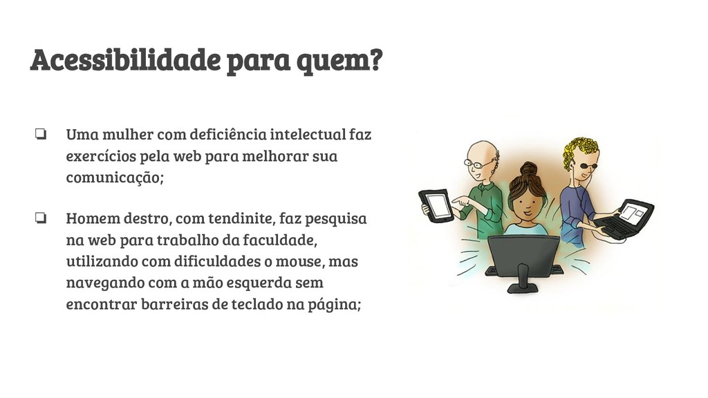 exercícios pela web para melhorar sua comunicação; ❏ Homem destro, com tendinite, faz pesquisa na web para trabalho da faculdade, utilizando com dificuldades o mouse, mas navegando com a mão esquerda sem encontrar barreiras de teclado na página;