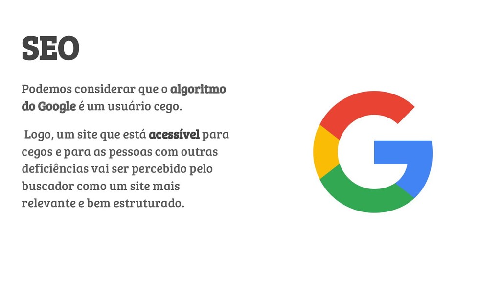 usuário cego. Logo, um site que está acessível para cegos e para as pessoas com outras deficiências vai ser percebido pelo buscador como um site mais relevante e bem estruturado.