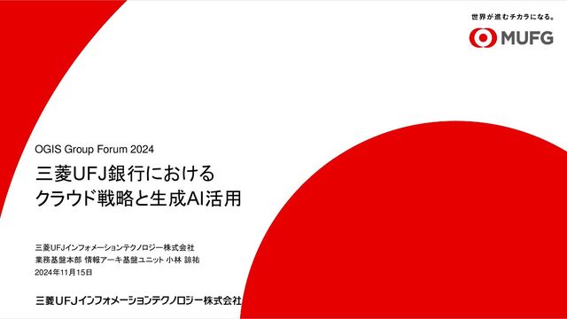 三菱UFJ銀行における クラウド戦略と生成AI活用 OGIS Group Forum 2024 三菱UFJインフォメーションテクノロジー株式会社 業務基盤本部 情報アーキ基盤ユニット 小林