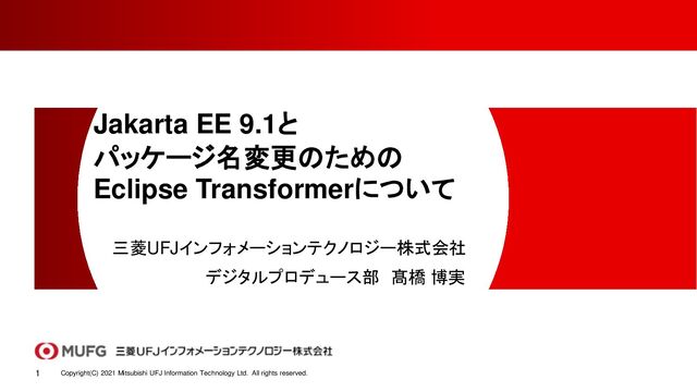 目次 ◼ Jakarta EE概要 ◼ Jakarta EE 9 及び 9.1 について ◼ Eclipse Transformerについて ◼ まとめ Copyright(C) 2019 Mitsubishi UFJ Information Technology Ltd. All rights reserved. 6