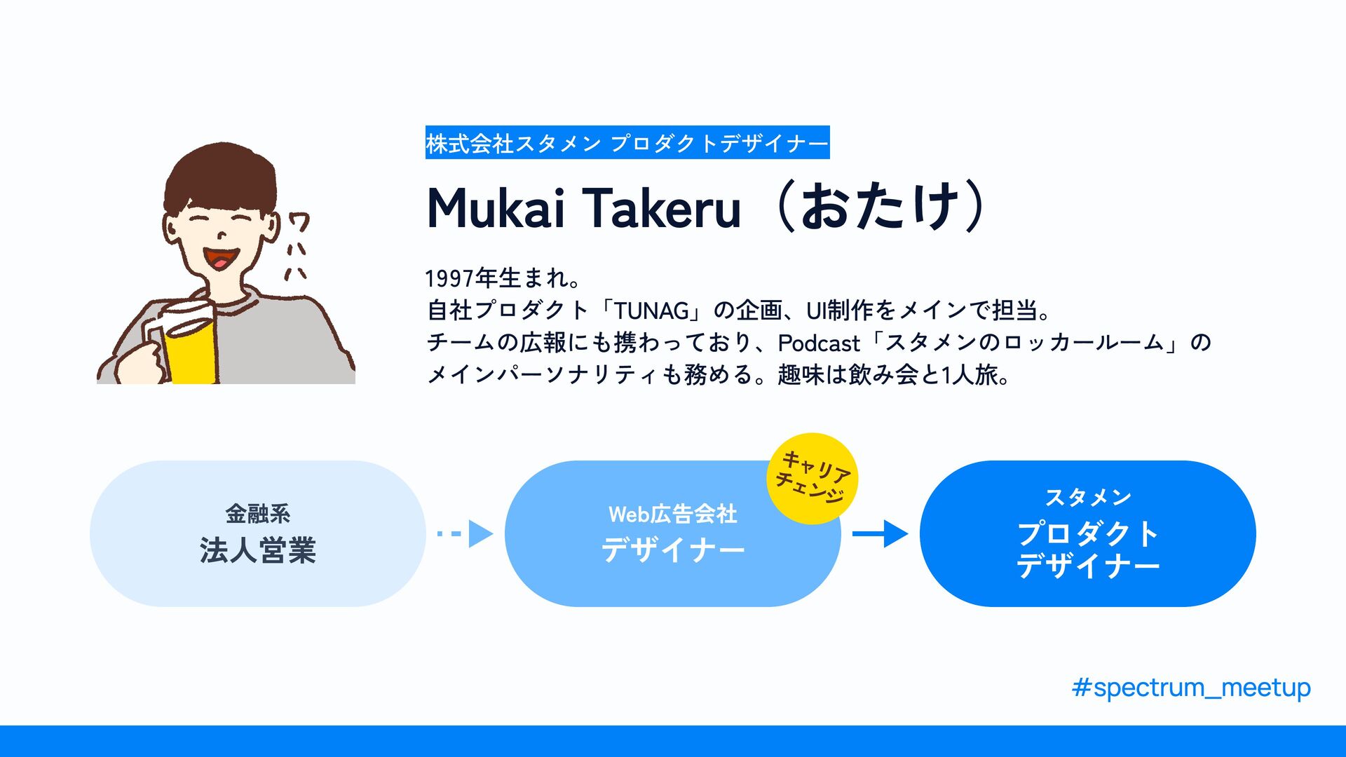 #spectrum_meetup 株式会社スタメン プロダクトデザイナー Mukai Takeru(おたけ) 1997年生まれ。 自社プロダクト「TUNAG」の企画、UI制作をメインで担当。 チームの広報にも携わっており、Podcast「スタメンのロッカールーム」の メインパーソナリティも務める。趣味は飲み会と1人旅。 金融系