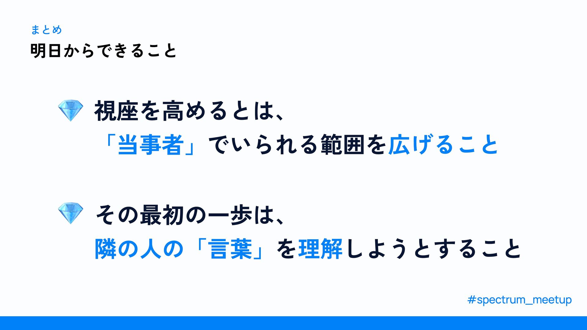 まとめ 明日からできること 視座を高めるとは、 でいられる範囲を 「当事者」 広げること その最初の一歩は、 を しようとすること 隣の人の「言葉」