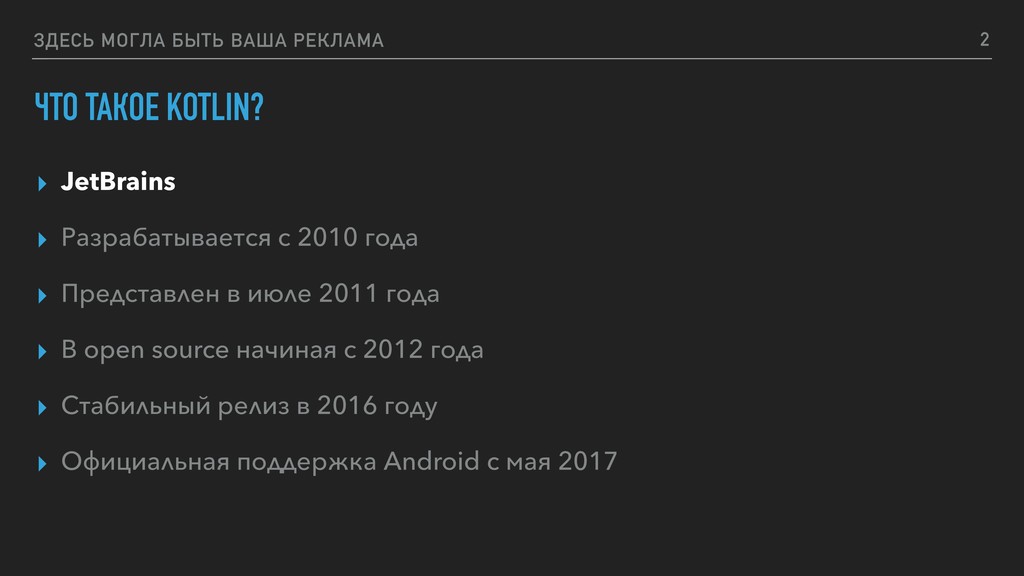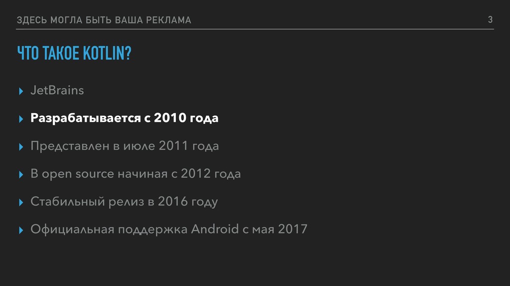 ▸ Разрабатывается с 2010 года ▸ Представлен в июле 2011 года ▸ В open source начиная с 2012 года ▸ Стабильный релиз в 2016 году ▸ Официальная поддержка Android c мая 2017 3