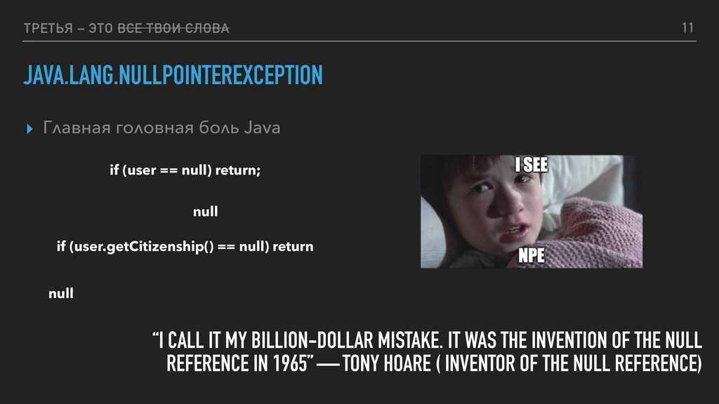боль Java if (user == null) return; if (user.getCitizenship() == null) return 11 null null “I CALL IT MY BILLION-DOLLAR MISTAKE. IT WAS THE INVENTION OF THE NULL REFERENCE IN 1965” — TONY HOARE ( INVENTOR OF THE NULL REFERENCE)