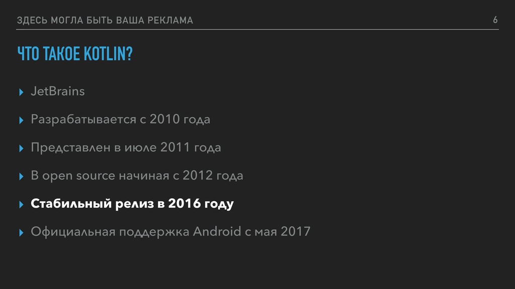 ▸ Разрабатывается с 2010 года ▸ Представлен в июле 2011 года ▸ В open source начиная с 2012 года ▸ Стабильный релиз в 2016 году ▸ Официальная поддержка Android c мая 2017 5