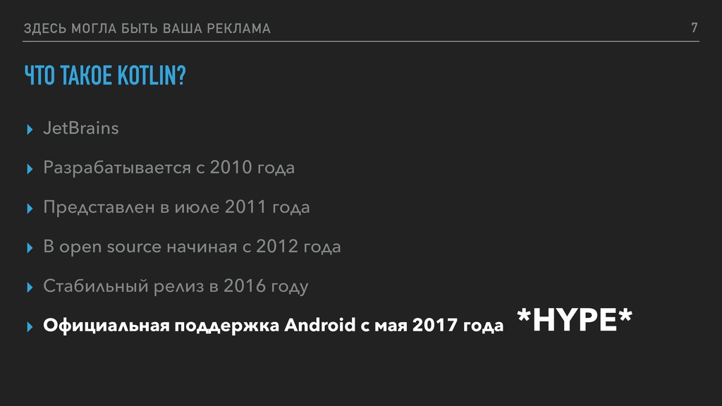 ▸ Разрабатывается с 2010 года ▸ Представлен в июле 2011 года ▸ В open source начиная с 2012 года ▸ Стабильный релиз в 2016 году ▸ Официальная поддержка Android c мая 2017 года *HYPE* 7