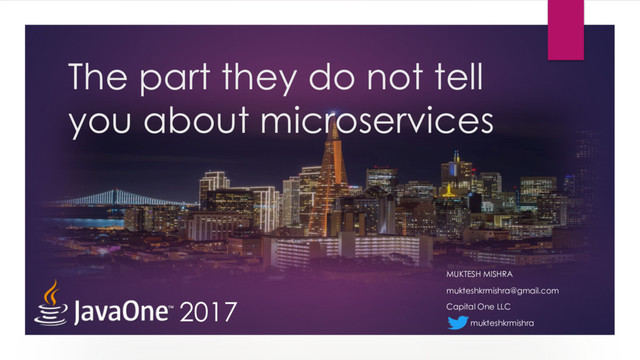 LLC u Interested in open-source, cloud and technology evangelism u Experienced in various Full stack technologies (UI to backend with DevOps added latest in armory) u Technical conference and meetup junkie u Open source contributor to various open source and Apache products (eg: Hystrix, Spinakker, etc.) u Reviewer in various JSRs u President, founder and member of various organizations/groups • Sunnyvale Java User Group • San Francisco Java User Group • Google Developer Group (SF Edition) • Java Community Program u Twitter: • https://twitter.com/mukteshkrmishra u Linked-in • https://www.linkedin.com/in/mukteshkrmishra/