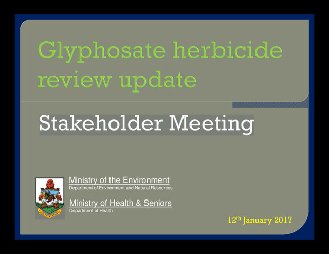 humans. Nov 2015 – EFSA result prompted the Minister to relax importation suspension on dilute products (<2%). Feb 2016 – DENR/DoH – Stakeholder presentation . At which the department committed to the following: 1. Complete detection study by July 2016. 2. Upon completion review findings in conjunction with EU studies. Submit recommendation to the Ministry. 3. During study to work with importers to identify effective and environmentally friendly alternatives 4. Promote the implementation of vegetation management strategies that incorporate Integrated Pest Management 5. Permit the importation of RTU glyphosate formulations <2% active ingredients 6. Continue ban on concentrated forms until final decision on importation is made Timeline