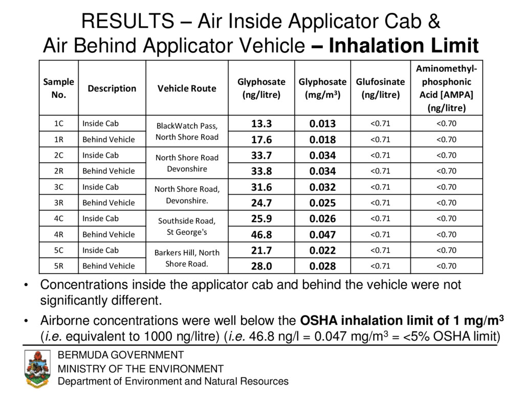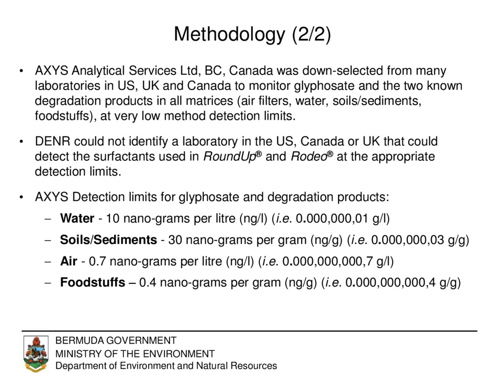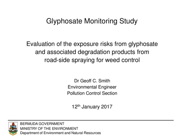 Natural Resources RESULTS – Other Chemicals Gov’t Monitors in Potable Water • Other chemicals listed (opposite) are determined from the Government potable water plants - 2015: Tynes Bay SWRO, Tudor Hill, Prospect, St George’s and the Distribution Lines. • These ensure that the water complies with standards of UK Drinking Water Inspectorate • To date glyphosate always below detection limit (i.e. <10,000 ng/l) Parameter Determined Units Concen- tration Parameter Determined Units Concen- tration Inorganics Pesticides and Herbicides Nitrate + Nitrite mg/L 0.1 - 2.3 Temephos µg/L <10 Nitrate mg/L 0.1 - 2.3 Paraquat µg/L <1 Nitrite mg/L <0.01 Guthion (Azinphos-methyl) µg/L <2 Turbidity NTU <0.2 Diuron µg/L <10 Dissolved Sulphate mg/L 8 - 21 Diquat µg/L <7 Phenols-4AAP mg/L <0.001 Glyphosate µg/L <10 pH pH 7 - 8 Lindane µg/L <0.006 Fluoride mg/L <0.1 Heptachlor µg/L <0.006 Total Dissolved Solids mg/L 240 - 320 Aldrin µg/L <0.006 Mercury mg/L <0.0001 Heptachlor epoxide µg/L <0.006 Pesticides and Herbicides (&Semi-Vol) Oxychlordane µg/L <0.006 Simazine µg/L <1 a-Chlordane µg/L <0.006 Prometryne µg/L <0.25 g-Chlordane µg/L <0.006 Picloram µg/L <5 Methoxychlor µg/L <0.02 Phorate µg/L <0.5 Dieldrin µg/L <0.006 Pentachlorophenol µg/L <0.5 p,p-DDT µg/L <0.006 Ethyl Parathion µg/L <1 o,p-DDT µg/L <0.006 Metribuzin (Sencor) µg/L <5 p,p-DDD µg/L <0.006 Metolachlor µg/L <0.5 o,p-DDD µg/L <0.006 Malathion µg/L <5 p,p-DDE µg/L <0.006 Dinoseb µg/L <1 o,p-DDE µg/L <0.006 Dimethoate µg/L <2.5 Poly-Chlorinated BiPhenyls (PCBs) Aroclor 1248 µg/L <0.05 Diclofop-methyl µg/L <0.9 Aroclor 1242 µg/L <0.05 Dicamba µg/L <1 Aroclor 1232 µg/L <0.05 Diazinon µg/L <1 Aroclor 1221 µg/L <0.05 Cyanazine (Bladex) µg/L <1 Aroclor 1016 µg/L <0.05 Chlorpyrifos (Dursban) µg/L <1 Aroclor 1254 µg/L <0.05 Carbofuran µg/L <5 Aroclor 1260 µg/L <0.05 Carbaryl µg/L <5 Volatile Organics Bromoxynil µg/L <0.5 Bromodichloromethane µg/L <0.1 Bendiocarb µg/L <2 Chloroform µg/L 0.1 Atrazine + Desethyl-atrazine µg/L <1 Bromoform µg/L 0.4 - 1.8 Des-ethyl atrazine µg/L <0.5 Dibromochloromethane µg/L <0.2 Atrazine µg/L <0.5 Total Trihalomethanes µg/L 0.4 - 1.8 Aldicarb µg/L <5 Calculated Parameters Alachlor µg/L <0.5 Total PCB's µg/L <0.05 2,4-Dichlorophenol µg/L <0.5 Total Endosulfan µg/L <0.005 2,4-D µg/L <1 o,p-DDT + p,p-DDT µg/L <0.006 2,4,6-Trichlorophenol µg/L <0.5 o,p-DDE + p,p-DDE µg/L <0.006 2,4,5-T µg/L <1 o,p-DDD + p,p-DDD µg/L <0.006 2,3,4,6-Tetrachlorophenol µg/L <0.5 Heptachlor + Heptachlor epoxide µg/L <0.006 Terbufos µg/L <0.5 DDT+ Metabolites µg/L <0.006 Triallate µg/L <1 Chlordane (Total) µg/L <0.006 Trifluralin µg/L <1 Aldrin + Dieldrin µg/L <0.006 Benzo(a)pyrene µg/L <0.009