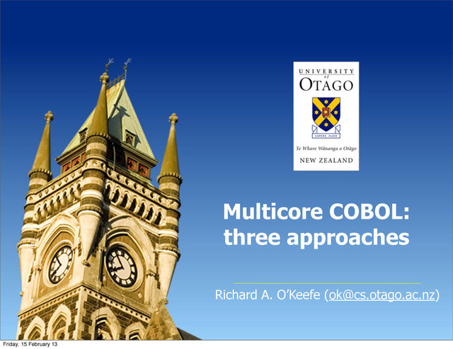 And it’s 43 years old. • And components are written in COBOL. • Or rather, restricted COBOL with embedded EXEC CICS statements, which are translated to RTS calls. • Each component is a separate COBOL program. • A sequential one. • Communicating with others through queues, files, and databases. • Semantics = processes, implementation = threads. 17 Friday, 15 February 13