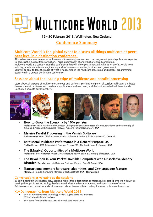 Multicore World is the global event to discuss all things multicore at peer- peer level in a destination conference All modern computers are now multicore and increasingly so; we need the programming and application expertise to harness this current transformation. This is a permanent change that affects all computing. Multicore World is a content intensive conference that will allow you to network with other professionals from industry, academia, science, engineering and software communities, business and government. You will be able to take the pulse of what is happening in the multicore processing and parallel programming ecosystem in a unique destination conference. Sessions about the leading edge of multicore and parallel processing Learn about all aspects of multicore technology and business. Sessions and panel discussions will cover the latest developments in software and hardware, applications and use cases, and the businesses behind these trends. Confirmed keynote guest speakers: • How to Grow the Economy by 10% per Year Professor Ian Foster - Arthur Holly Compton Distinguished Service Professor of Computer Science at the University of Chicago & Argonne Distinguished Fellow at Argonne National Laboratory. USA • Massive Parallel Processing in the Varnish Software Poul-Henning Kamp - Chief Architect, Varnish Software & Author (of a lot of) FreeBSD. Denmark • Bare-Metal Multicore Performance in a General-Purpose OS Paul McKenney - IBM Distinguished Engineer & Linux CTO, IBM Academy of Technology. USA • The (Massive) Opportunities of a Multicore World Professor Barbara Chapman - OpenMP Architecture Review Board & University of Houston. USA • The Revolution in Your Pocket: Invisible Computers with Dissociative Identity Disorder. Tim Mattson - Intel Principal Engineer, Khronos OpenCL Group. USA • Transactional memory hardware, algorithms, and C++ language features Mark Moir – Oracle, Consulting Member of Technical Staff. USA – New Zealand Conversations as valuable as the sessions By being hosted in Wellington, New Zealand makes this a destination conference, key participants will not just be passing through. Meet technology leaders from industry, science, academia, and open source software. Talk to customers, investors and entrepreneurs about how are they creating the new ventures of tomorrow. Key Demographics from Multicore World 2012 • 94% of attendants were technology leaders, buyers, users and endorsers • 51% of attendants from Industry • 34% came from outside New Zealand to Multicore World 2012