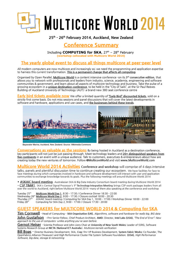 Including COMPUTING for SKA, 27th – 28th February (workshop collocated with Multicore World 2014) The yearly global event to discuss all things multicore at peer-peer level All modern computers are now multicore and increasingly so; we need the programming and application expertise to harness this current transformation. This is a permanent change that affects all computing. Organised by Open Parallel, Multicore World is a content intensive conference -on its 3rd consecutive edition, that allows you to network with professionals and leaders from industry, science, academia, engineering and software communities & government, and learn about all aspects of multicore technology and business. Take the pulse of a growing ecosystem in a unique destination conference, to be held in the “City of Sails”, at the Sir Paul Reeves Building of Auckland University of Technology (AUT): a brand new 380 seat conference centre Early bird tickets available now We offer a limited quantity of “Early Bird” discounted tickets, sold on a strictly first come basis. Do not miss sessions and panel discussions that will cover the latest developments in software and hardware, applications and use cases, and the businesses behind these trends. Bayswater Marina, Auckland, New Zealand. Source: Wikimedia Commons Conversations as valuable as the sessions By being hosted in Auckland as a destination conference, key participants will not just be just passing through. Meet technology leaders and 20+ distinguished speakers from five continents in an event with a unique audience. Talk to customers, executives & entrepreneurs about how are creating today the new ventures of tomorrow. Follow @MulticoreWorld and visit www.MulticoreWorld.com Multicore World 2014 Activities Conference and workshop will comprise of 4 days intensive talks, panels and plentiful discussion time to continue creating our ecosystem. We have facilities for face to face meetings during which companies involved in hardware and software development will interact with user and application communities to exchange knowledge towards its goals. Plus the following meetings will around Multicore World 2014 * ASKAIC board meeting. Australasian SKA & Big Data Industry Consortium board meeting during Multicore World 2014 * CSP TIM#1. SKA's Central Signal Processor's 1st Technology Integration Meeting brings CSP work packages leaders from all over the world to Auckland, right before Multicore World 2014 -many of them also speaking at the conference and workshop Tuesday 25th Multicore World Day 1, 8:30 – 17:30 / Conference Dinner 18:30 – 22:00 Wednesday 26th Multicore World Day 2, 9:00 – 17:30 / Closure cocktail 18:00 – 20:30 Thursday 27th ASKAIC board meeting / Computing for SKA Day 1, 10:00 – 17:00 / Workshop Dinner 18:00 – 22:00 Friday 28th Computing for SKA Day 2, 9:00 – 17:00 / Closure 17:30 – 20:00 GUEST SPEAKERS for MULTICORE WORLD 2014 & Computing for SKA Tim Cornwell - Head of Computing – SKA Organisation (UK). Algorithms, software and hardware for really big, BIG data John Gustafson – Fmr Senior Fellow, Chief Product Architect, AMD; Director, Intel Labs (USA). “The End of Error”: New approach to the use of computers -unlike anything you've seen before. Gernot Heiser - Scientia Professor and John Lions Chair at University of New South Wales; Leader of SSRG, Software Systems Research Group at NICTA (National ICT Australia). Multicore kernels verification Bill Boas – Director Business Development, SKA, Cray; fmr VP Business Development, System Fabric Works; Co-founder, The OpenFabrics Alliance (Treasurer) and High Performance Cluster File System Software Foundation; (USA). High Performance Software, big data, storage & networking
